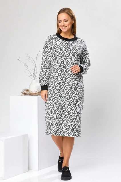 Платье женское, предназначено для повседневной носки. Платье женское, прямого силуэта, длиной за колено. Перед и спинка цельнокроеные. Горловина круглая, с втачной отделочной планкой, шов соединения который декорирован надстрочной отделочной тесьмой. Рукав втачной, длинный, реглан с притачной отделочной манжетой, шов соединения которой декорирован надстрочной декорированной тесьмой. Платье на подкладке. Платье без плечевых накладок. Длина спинки платья 107 см, длина рукава 67 см.