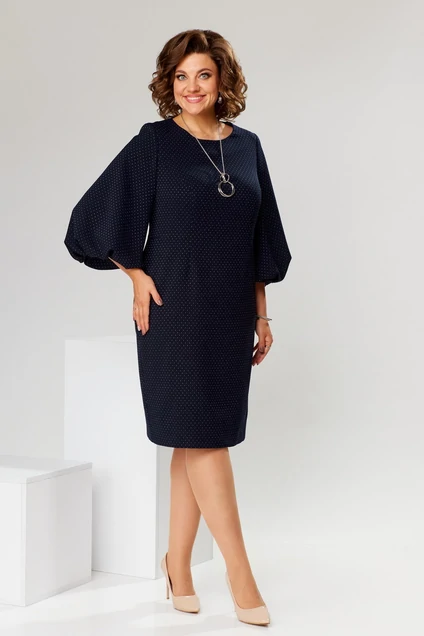 Платье женское относится к нарядной торжественной одежде. Платье женское полу прилегающего силуэта, длиной за колено. Перед с 2-мя отрезными бочками, швы соединения их с передом переходят в таллиевую вытачку. Спинка с 2-мя таллиевыми вытачками со средним швом, заканчивающимся шлицей. Горловина круглая обточная без воротника. Застёжка на потайную тесьму - молнию. Рукав втачной, одно шовный, расширенный к низу, с 5-ю встречными складками по низ, низ обтачной. Рукав на подкладке. Платье на подкладке. Платье с плечевыми накладками. К платью прилагается съёмное украшение. Длина спинки платья 100 см, длина рукава 50 см.
