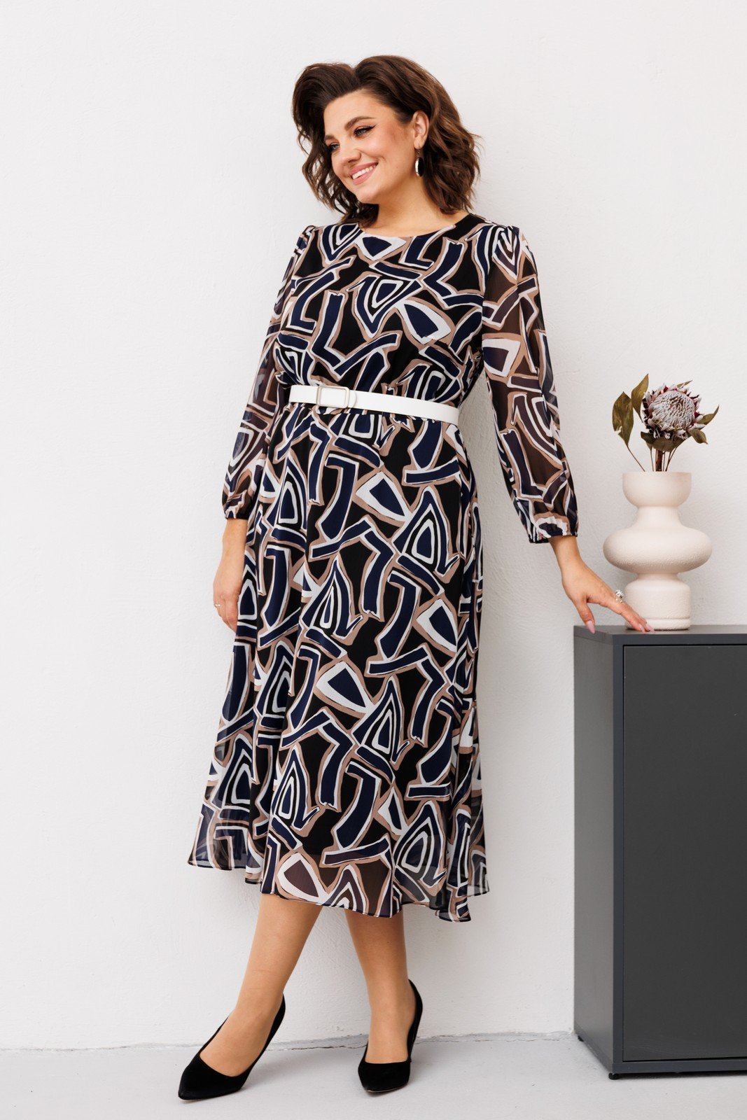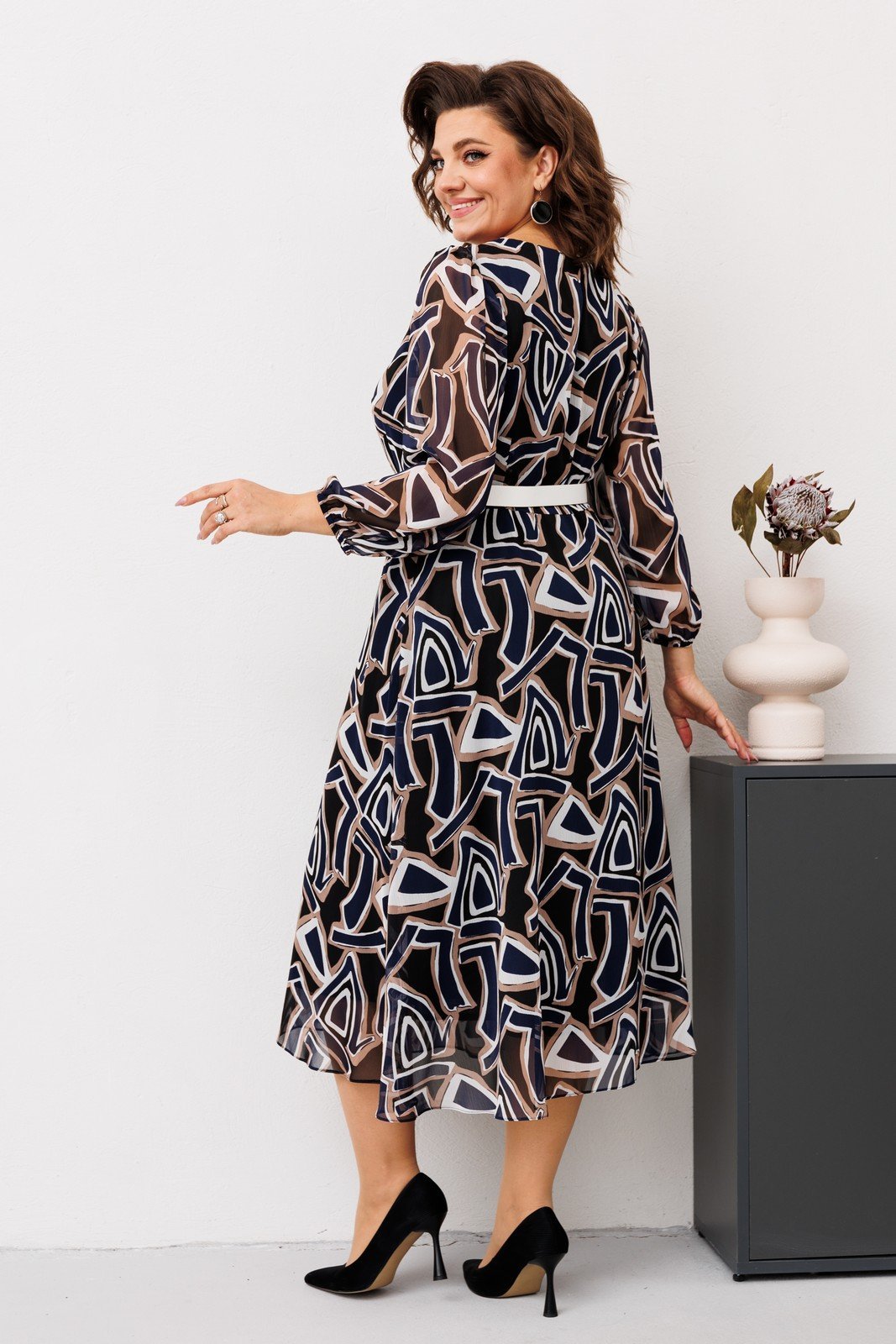 Платье женское отрезное по линии талии, расширенное к низу, длиной до середины икры. Верхняя часть переда с 2-мя нагрудными вытачками, нижняя цельнокроеная. Верхняя часть спинки с 2-мя таллиевыми вытачками, с обтачным разрезом по центру, фиксирующимся по горловине на 1-ну навесную петлю и 1-ну пришивную пуговицу; нижняя часть с 2-мя таллиевыми вытачками. Горловина круглая обточная, без воротника. Застёжка на потайную тесьму-молнию в левом боковом шве платья. Рукав втачной, одно шовный, по окату с лёгкой сборкой, длиной 7/8, низ собран на эластичную тесьму. Платье на подкладке. Платье без плечевых накладок. К платью прилагается отдельный ремень. Длина спинки платья 120 см, длина рукава 56 см.