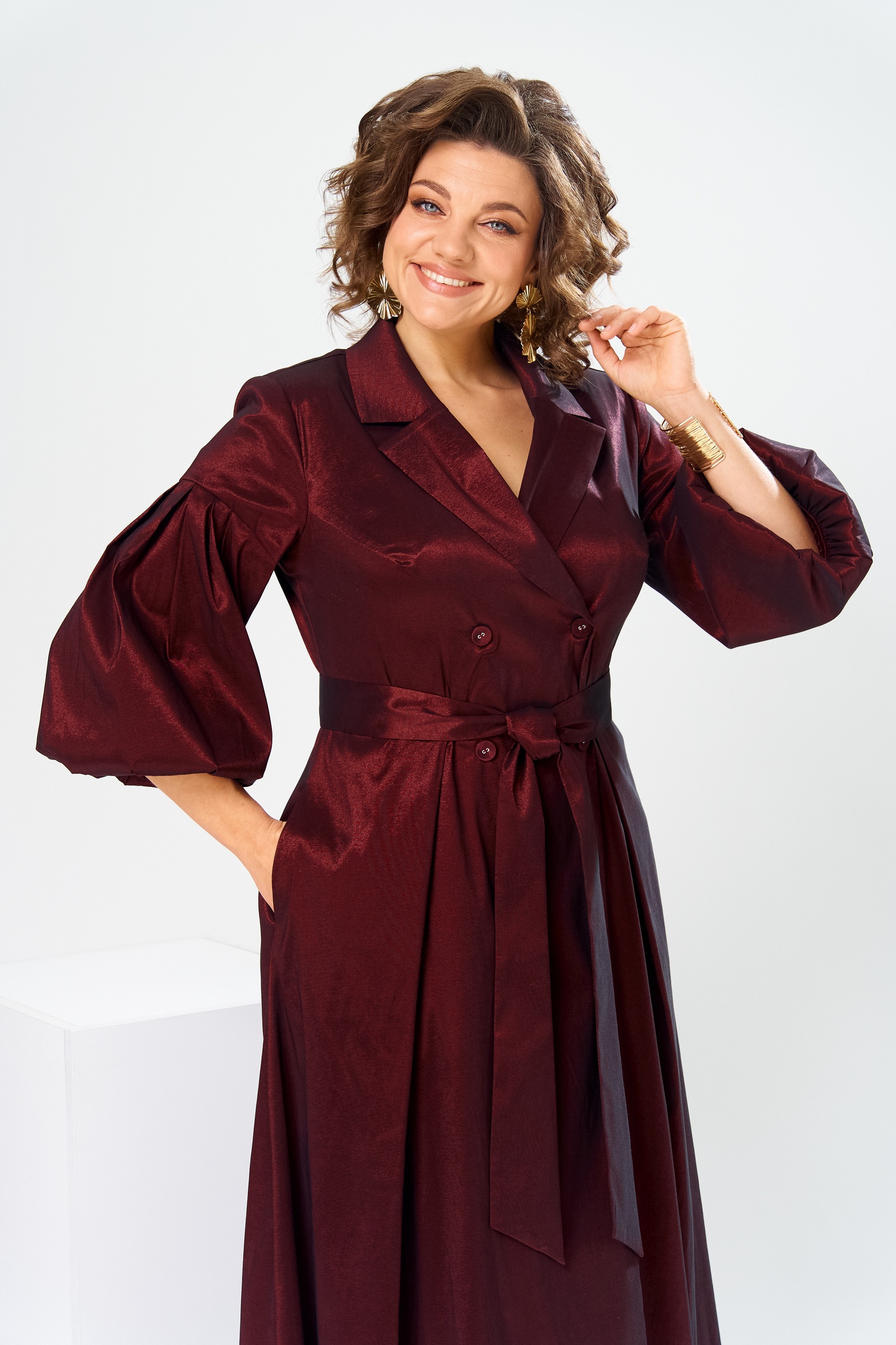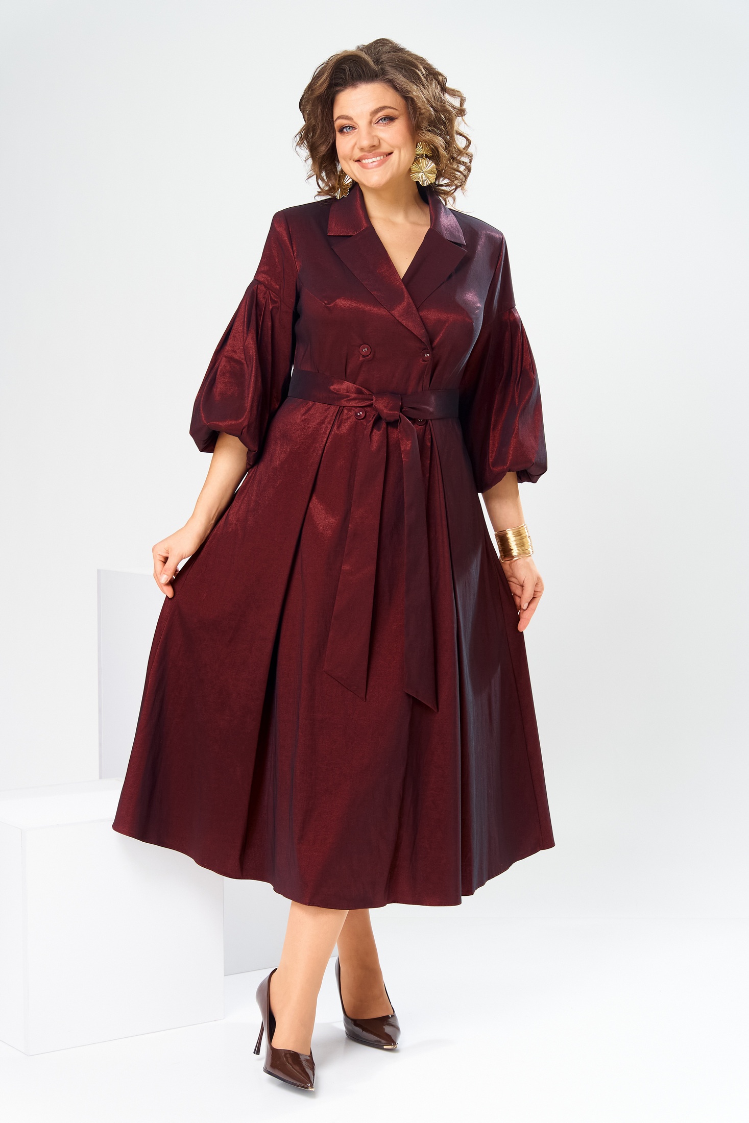 Платье 1-2837 бордовый-1 Romanovich style — идеальный выбор для торжественного события. Коллекция бренда Romanovich style представляет платье из 100% полиэстера, обеспечивающее легкость и комфорт. Фасон отрезной по талии с расширением к низу и длиной до нижней части икры придает женственный силуэт. Особенности включают V-образный вырез, вточной воротничок и центральную двухбортную застежку с пуговицами. Платье оснащено накладными карманами и съемным поясом для большего удобства. Рукава 3/4 расширенные, с эластичной тесьмой, добавляют изысканной динамики. Цвет бордовый и стильное оформление делают его оптимальным выбором для осенне-весеннего сезона. Длина спинки платья составляет 130 см, длина рукава — 47 см.