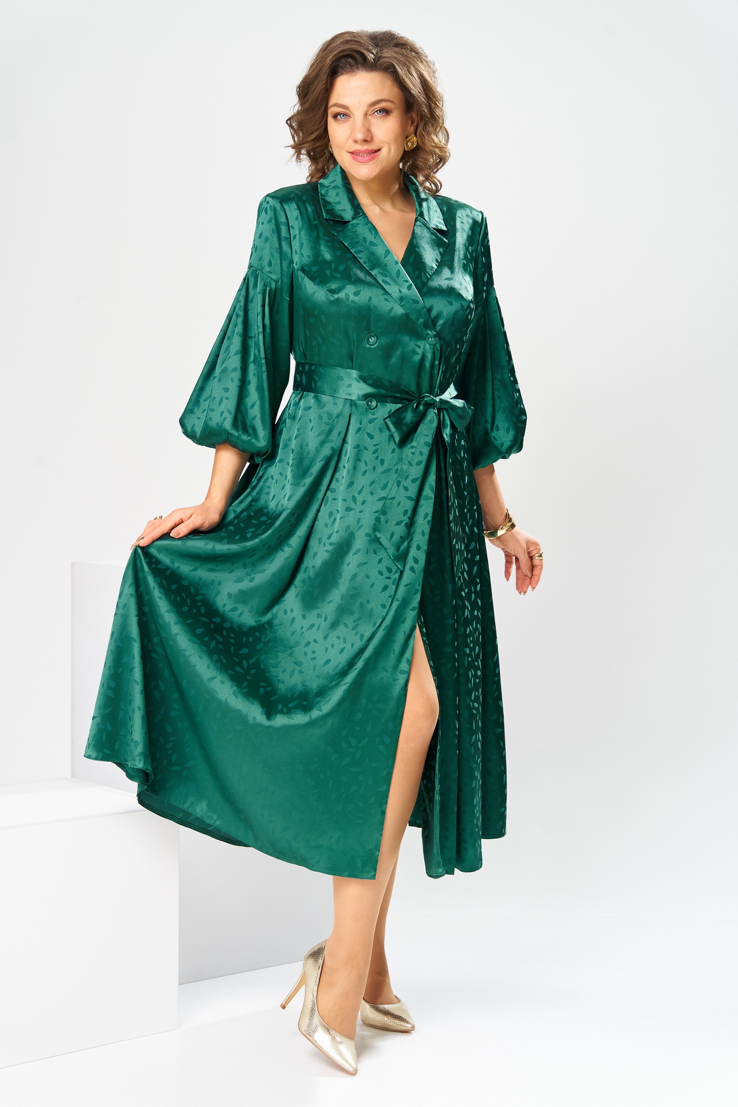 Платье женское, относится к торжественной одежде. Платье женское отрезное по линии талии, расширенное к низу, длиной до нижней части икры. Верхняя часть переда с 2-мя наружными выточками, нижняя часть с 2-мя односторонними складками. Верхняя часть спинки с 2-мя таллиевыми выточками, нижняя часть спинки с 2-мя односторонними складками. В боковых швах обработаны карманы. Горловина с V-образным вырезом, с вточным воротничком пиджачного типа с отрезным отложным лацканом. Застёжка центральная 2-х бортная на 4-и обмётанные петли и 4-и пришивные пуговицы. Рукав вточной одно шовный, длиной 3/4 с горизонтальным подрезом, нижняя часть рукава с 6-ю односторонними складками, низ рукава расширенный, обтачной, собран на эластичную тесьму. Рукав на подкладке. Платье на отлетной подкладке. Платье с плечевыми накладками. К платью прилагается съёмный пояс. Длина спинки платья 130 см, длина рукава 47 см.