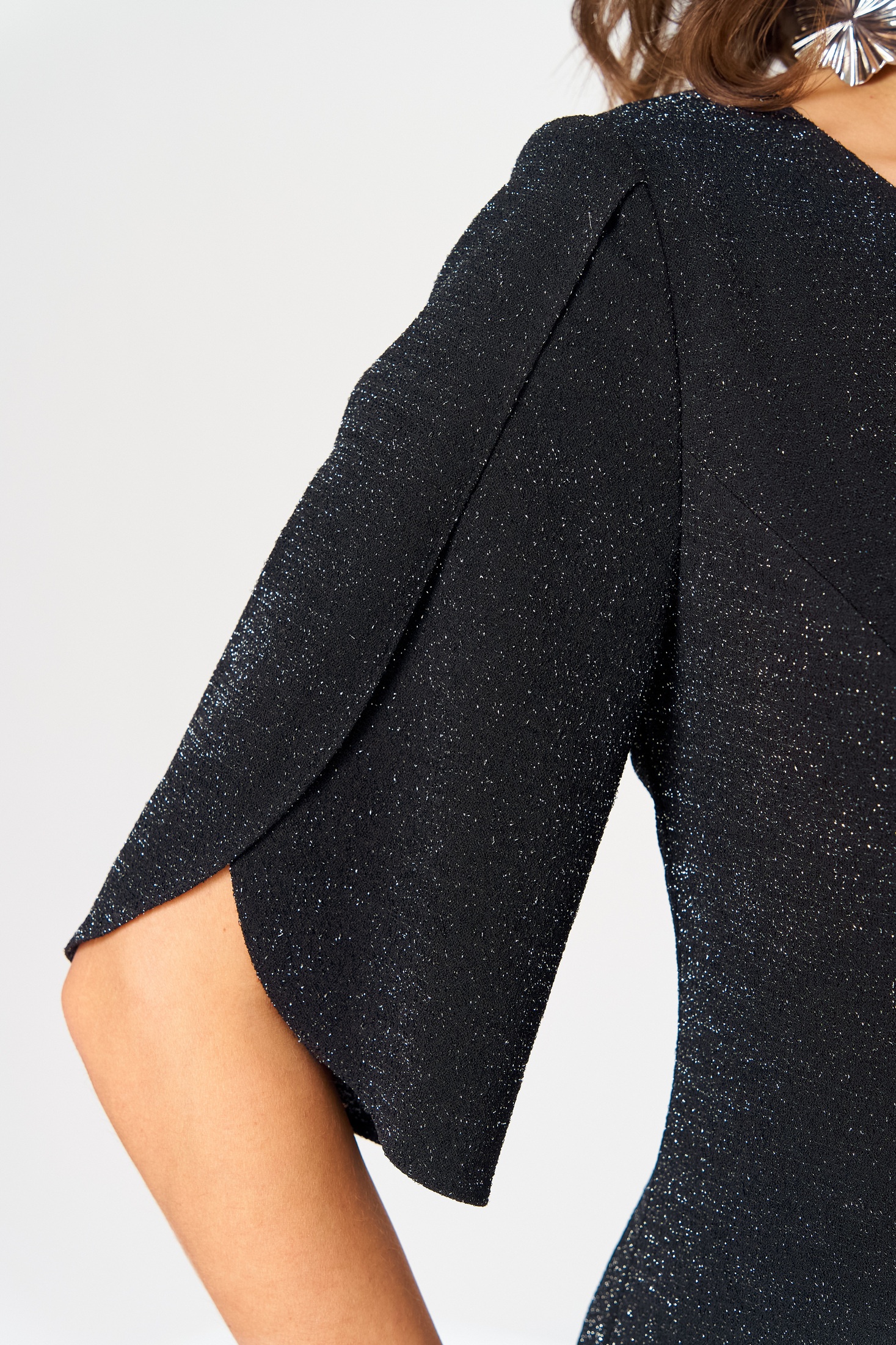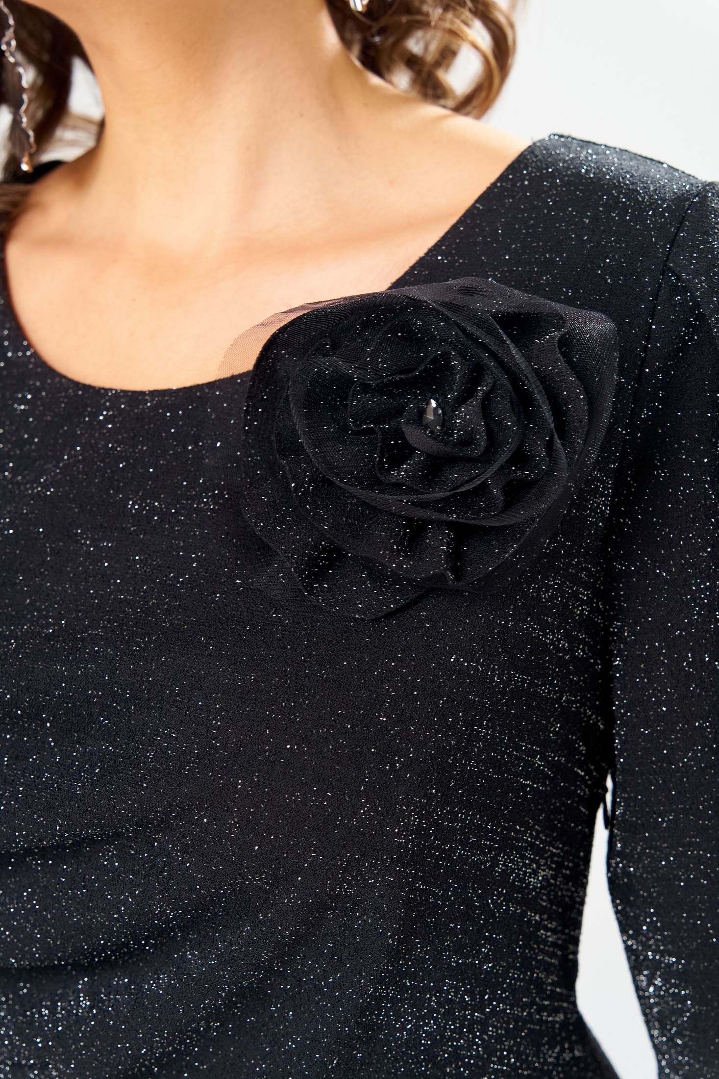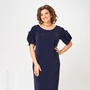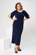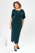Платье женское, предназначено к нарядной торжественной одежде. Платье женское, полу прилегающего силуэта, длиной до нижней части икры. Перед с 1-ним отрезным бочком справа, шов соединения его с передом заканчивается разрезом, перед отрезной по линии талии, верхняя часть с 4-мя зафиксированными складками, нижняя часть с 2-мя такими же складками расположенными справа по шву притачивания бочка. Спинка с 2-мя таллиевыми вытачками. Горловина круглая обточная без воротника. Застёжка на потайную тесьму-молнию в левом боковом шве платья. Рукав втачной, длиной до локтя с запахом по окату с закруглёнными концами. Платье на подкладке. Платье с плечевыми накладками. К платью прилагается съёмное украшение. Длина платья 128 см. Длина рукава 34 см.