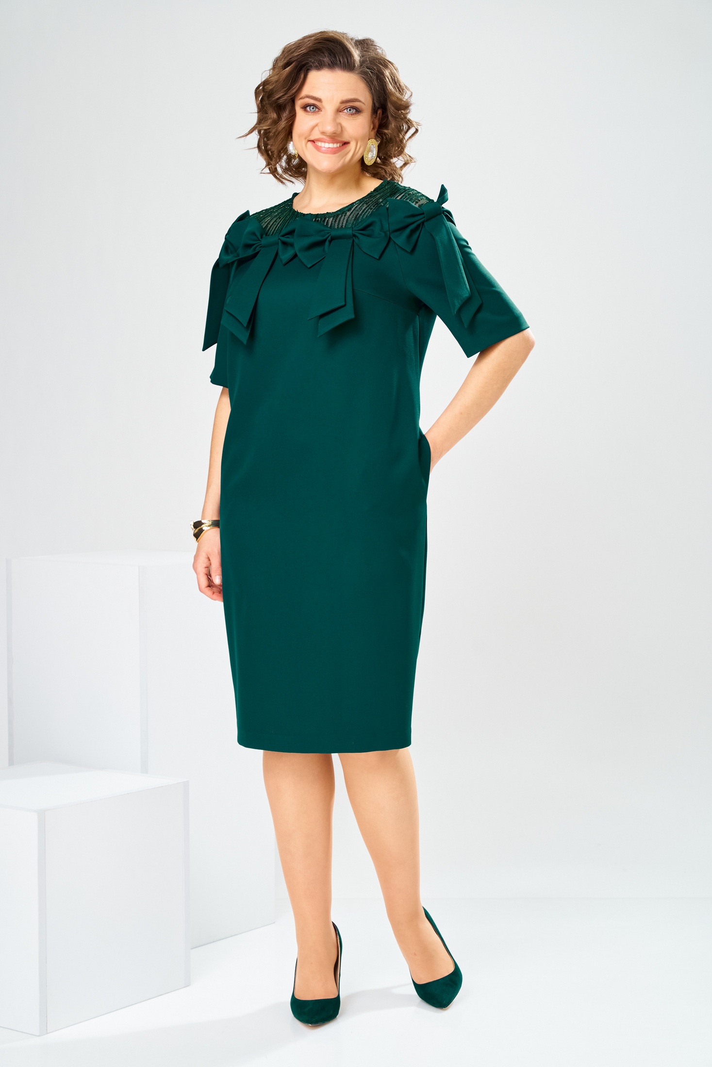 Платье 1-2899 изумруд Romanovich style идеально подходит для торжественных мероприятий. Коллекция бренда Romanovich style воплощает изысканность и стиль. Изделие выполнено из качественного материала, в состав которого входят полиэстер, вискоза и спандекс, что обеспечивает его долговечность и комфорт. Полуприлегающий силуэт создаёт элегантный образ, а длина за колено добавляет женственности. Особенности платья включают потайную тесьму-молнию на спинке, карманы в боковых швах и декор из четырёх настрочных бантов на передней части. Это платье изумрудного цвета станет идеальным выбором для особых случаев в любое время года. Длина платья по спинке 102 см, длина рукава 27 см.