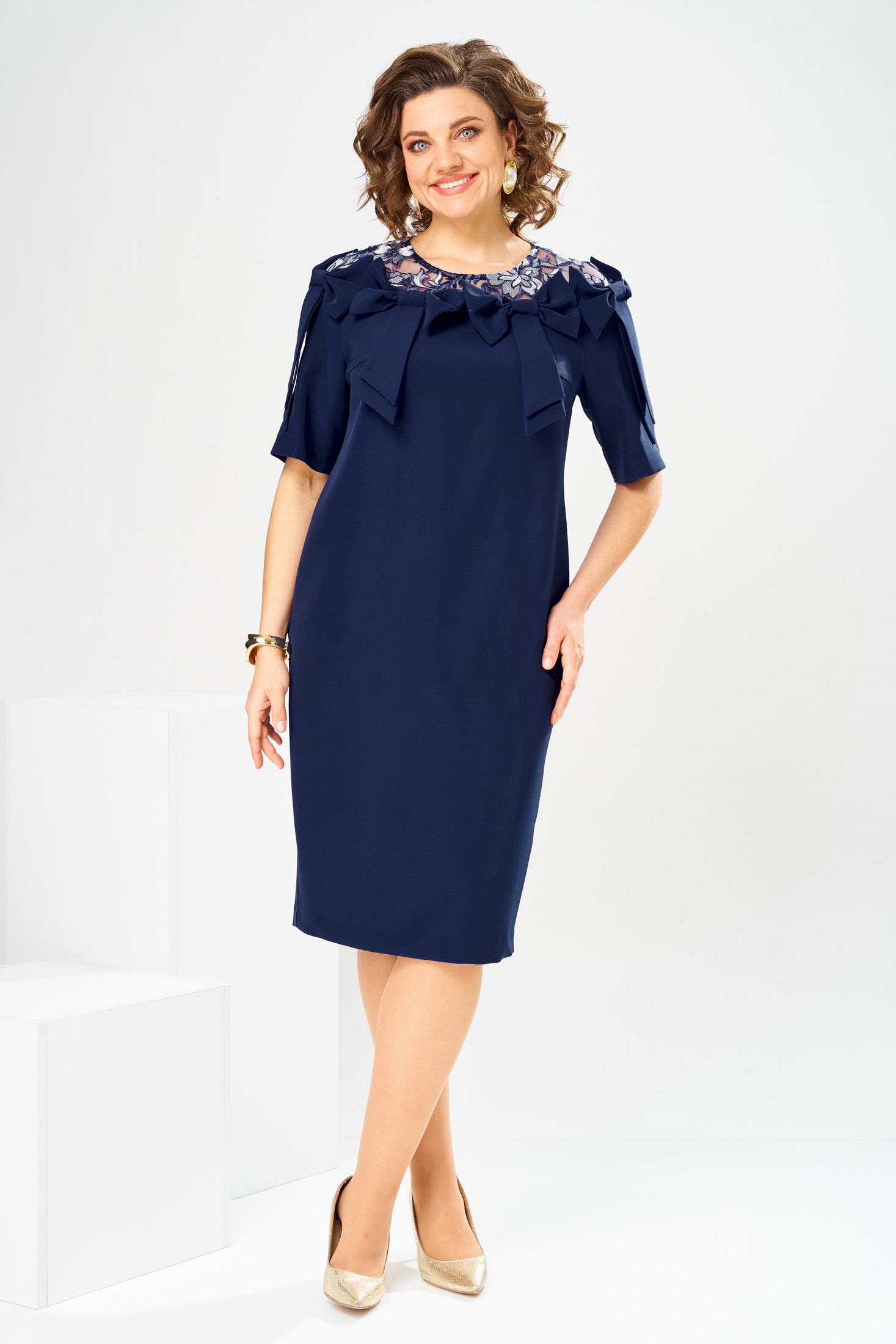 Платье 1-2899 сине-белый Romanovich style — это стильное и нарядное изделие коллекции бренда Romanovich. Изготовлено из комбинации полиэстера, вискозы и спандекса, что придаёт ткани упругость и легкость. Длина платья за колено, с изящным полуприлегающим силуэтом и отрезной кокеткой, которая переходит из рукавов, подчёркивая дизайн. Круглая обточная горловина и удобная потайная молния на спинке делают образ завершённым и акцентируют внимание на форме. Рукава длиной до локтя дополнены карманами в боковых швах для удобства. Платье декорировано четырьмя настрочными бантами, что добавляет изюминку. Идеально подходит для торжественных мероприятий в тёплое время года, а также для праздничных случаев. Глубокий синий цвет гармонично сочетается с белыми акцентами, создавая зрительный контраст. Длина платья по спинке 102 см, длина рукава 27 см.