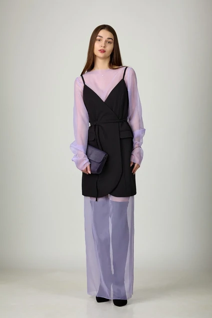 Комплект женский, состоящий из верхнего платья из плательно-костюмной ткани на подкладке и нижнего платья из прозрачной вуали. Верхнее платье полуприталенного силуэта, с рельефами по спинке и полочке. Прорезные карманы с клапанами по переду. Бретели регулируемые. Ширина платья регулируется завязками-шнурами. Нижнее платье прямого силуэта с нагрудными вытачками. Рукава – удлиненные, фиксируются браслетами, нарядными резинками и т.д. Аксессуары, фиксирующие рукава в комплект не входят.