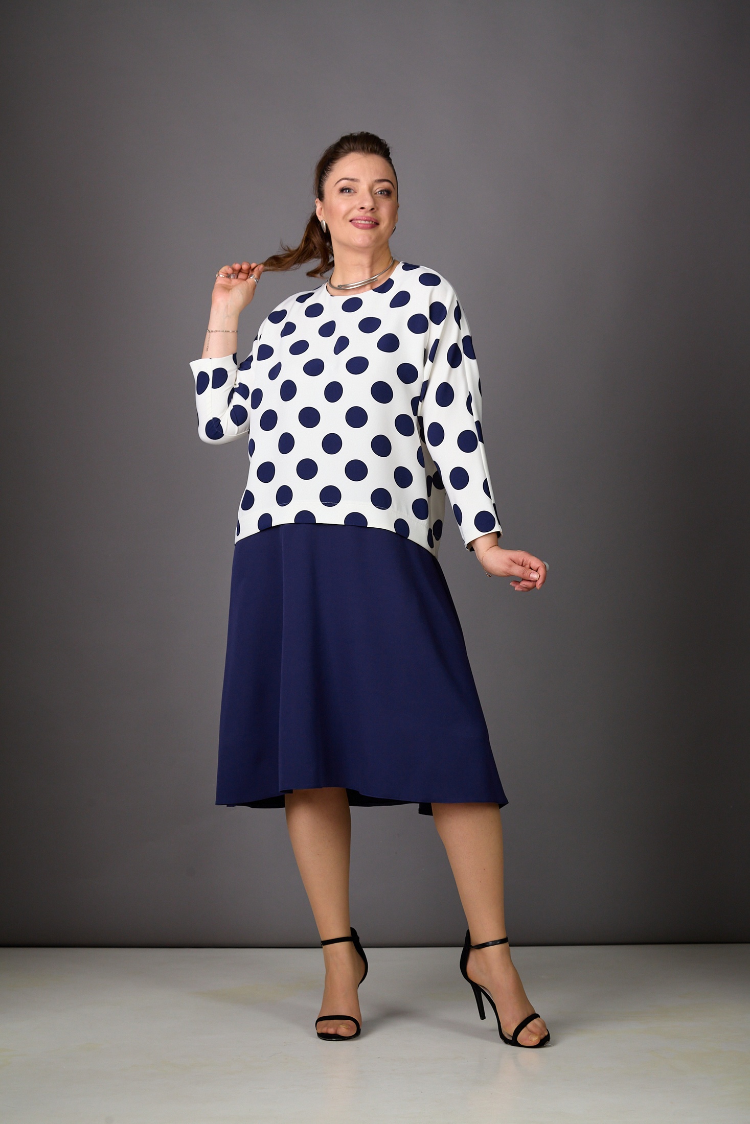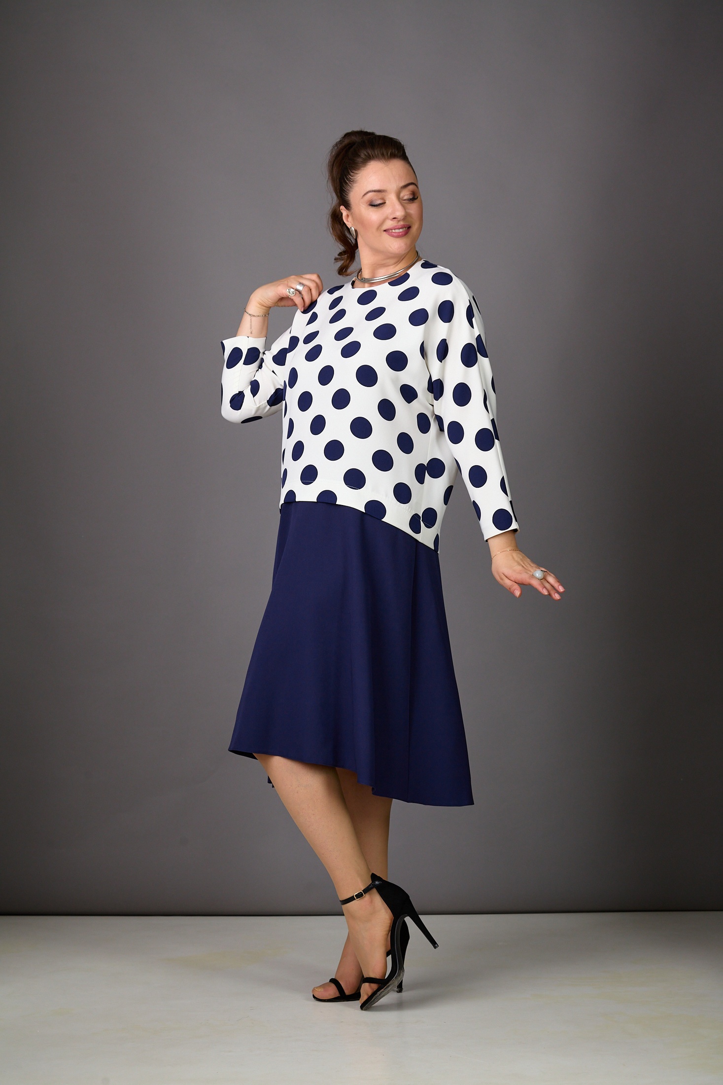 Платье 1182-1 молочный+темно-синий Rosheli — это уникальное сочетание стиля и комфорта. Коллекция бренда Rosheli предлагает платье из полиэстера и спандекса, обеспечивающее легкость и удобство на весь день. В верхней части фасон "летучая мышь", который подходит для разных типов фигур, а расклешенная юбка добавляет свободу движений. Ассиметричный крой с разницей в длине между передом и спинкой привнесет уникальность в ваш летний гардероб. Рукава длиной 3/4, по спинке имеется молния для удобства. Молочно-синий цвет и горошковый рисунок идеально подходят для теплых сезонов, даря свежесть и легкость образу.