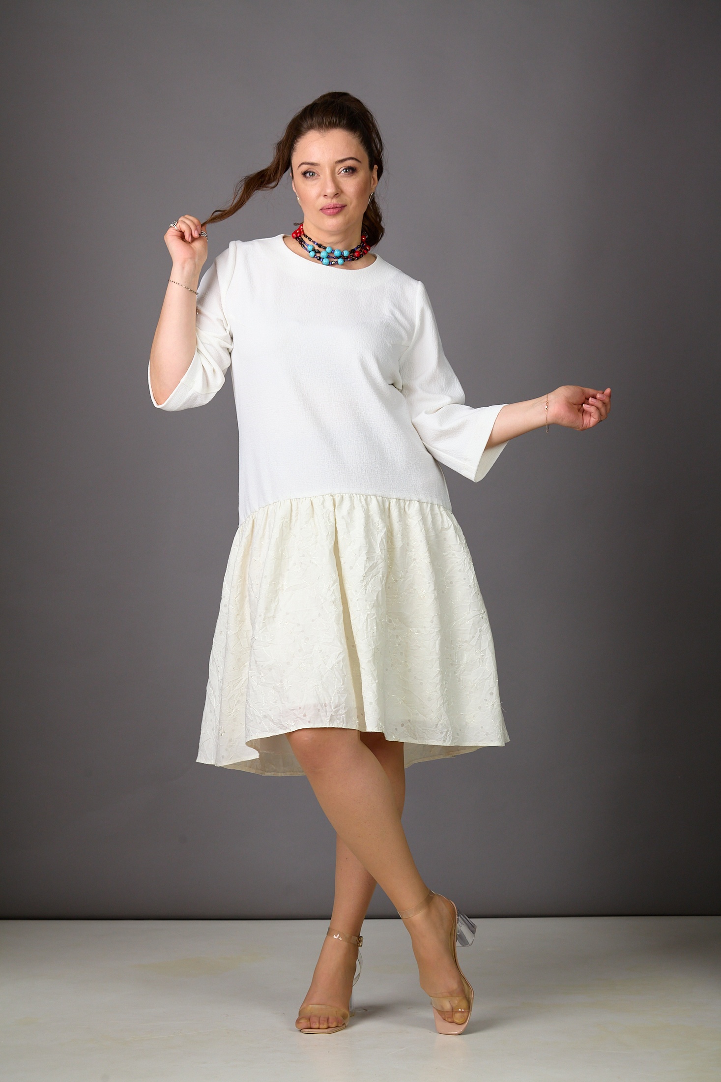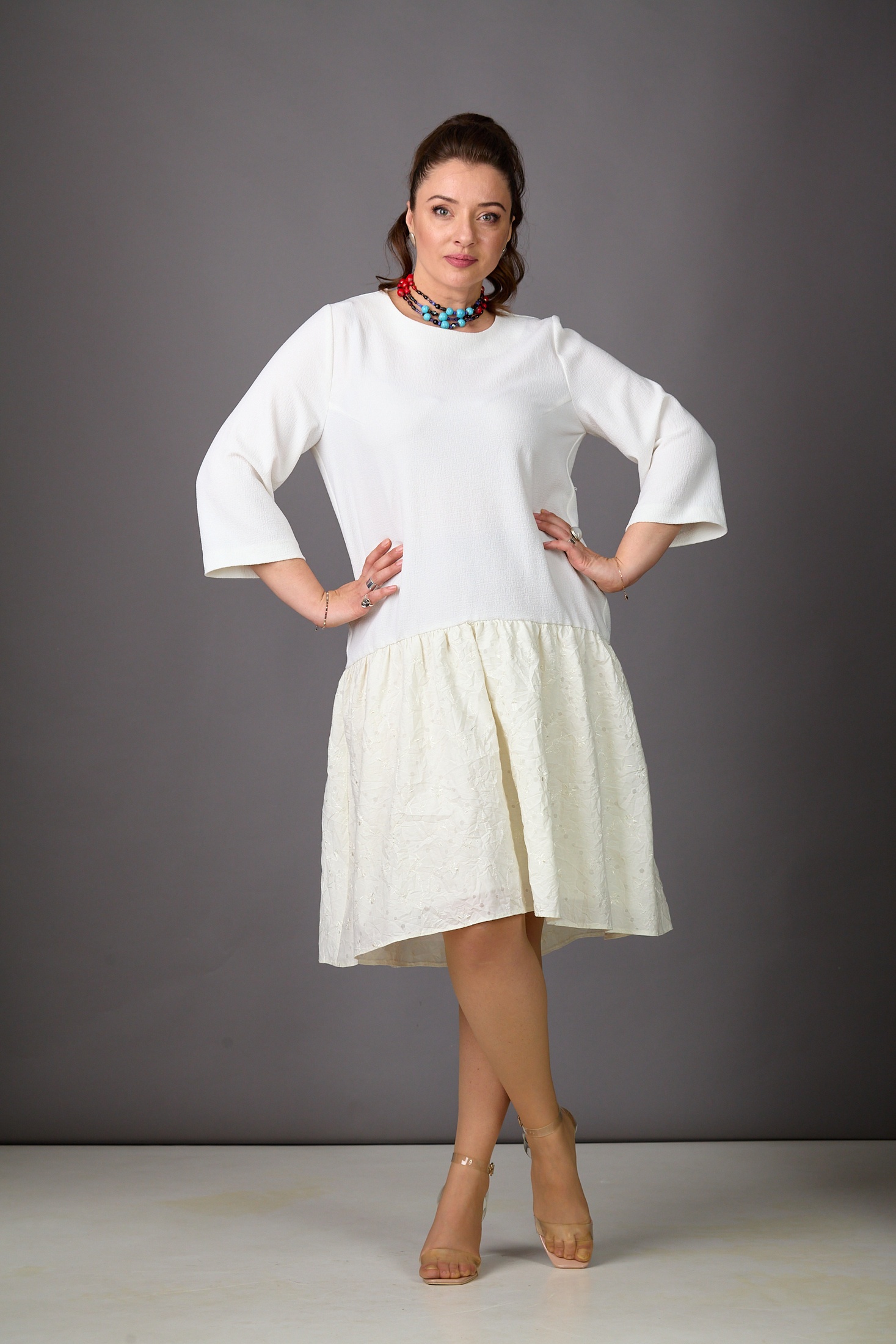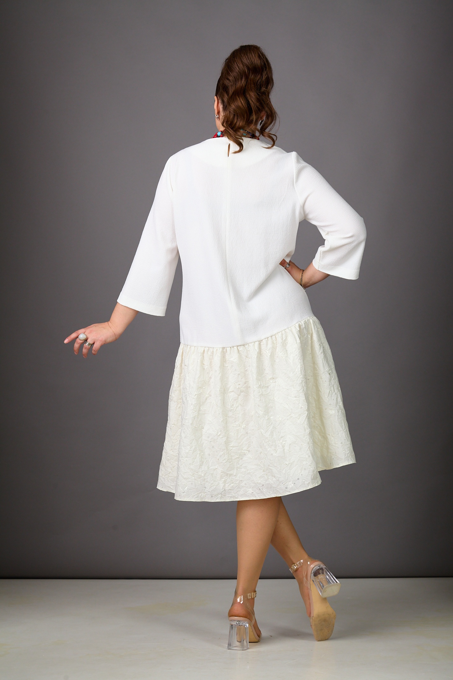 Платье 1183-2 молочный Rosheli представляет собой уникальное сочетание стиля и комфорта. Коллекция бренда Rosheli вдохновлена легкостью лета, что особенно подчеркнуто использованием жатого хлопка и плательного креша с вышивкой. Миди длина платья и 3/4 рукава делают его идеальным выбором для теплой весны или летнего дня. Ассиметрия длины между передом и спинкой, а также центральная молния по спинке добавляют оригинальности, создавая изюминку вашему образу. Платье выполнено в молочном цвете, подчеркивающем его воздушность и элегантность. Оно отлично подойдет как для повседневного, так и для праздничного настроения, добавив в ваш гардероб нотки свежести и утонченности.