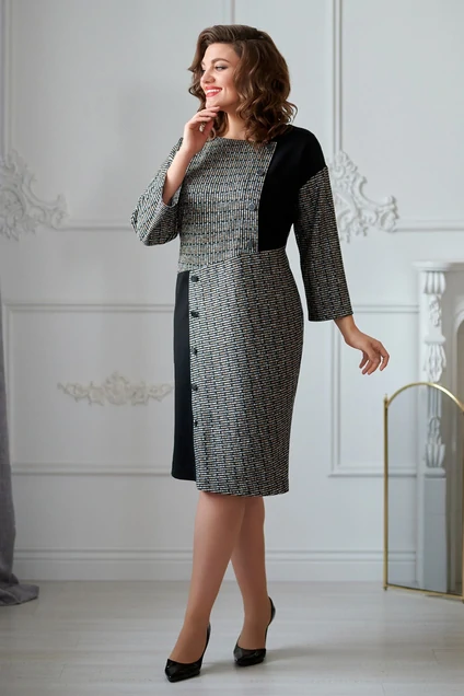 Платье женское, полуприлегающего силуэта из трикотажной ткани. Перед платья отрезной по линии талии, с декоративными линиями. Верхняя и нижняя часть с имитацией планки с пуговицами. Спинка со средним швом со шлицей. Рукав спущенный. Вырез горловины фигурный.