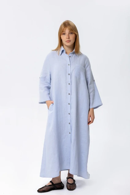 Элегантное платье-рубашка голубого цвета представляет собой идеальное сочетание утонченности и комфорта. Модель выполнена из легкой ткани и оснащена рядом пуговиц спереди, что добавляет изделию практичности и стиля. Длинные рукава и свободный крой гарантируют удобство носки. Платье отлично подойдет для создания повседневных образов и идеально сочетается как с классической, так и с более современной обувью.