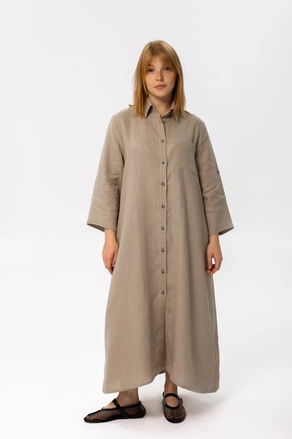 Элегантное светло-серый платье-рубашка выполнено из качественной легкой ткани. Дизайн изделия включает классический воротник, длинные прямые рукава и полную застежку на пуговицы спереди, что добавляет платью аккуратности и утонченности. Платье имеет свободный крой, что обеспечивает комфорт при носке. Эта модель идеально подойдет для создания как повседневного, так и более официального образа.