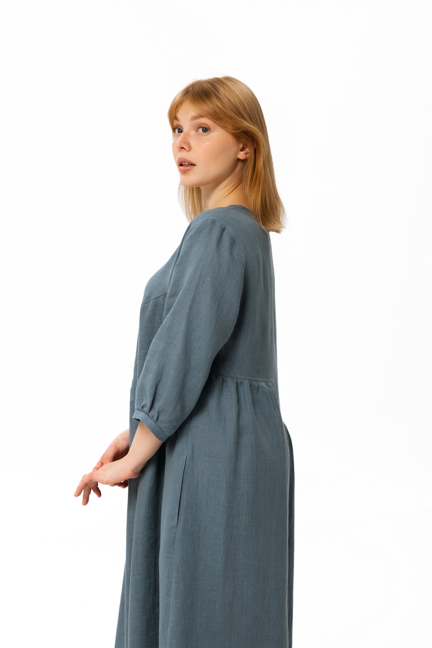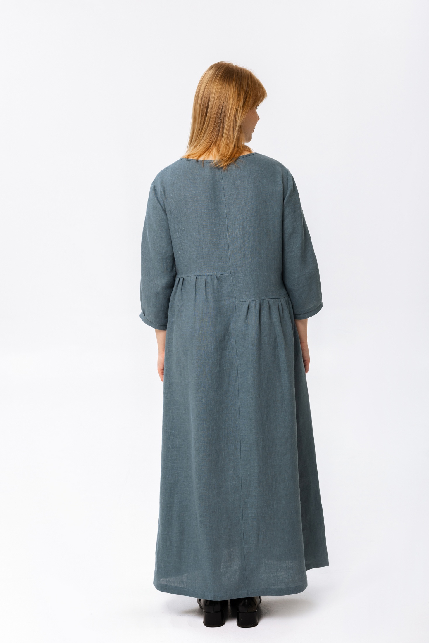 Элегантное длинное платье в стиле макси представлено в спокойном серо-голубом оттенке. Модель отличается строгими простыми линиями и минимализмом в деталях, создавая образ, наполненный утончённой женственностью. Платье с рукавами 3/4, обеспечивающими удобство и практичность. Крой платья мягко облегает фигуру, подчёркивая естественную элегантность силуэта, в то время как деликатные складки на талии добавляют объём и динамику образу. Идеально подойдёт для повседневной носки или особых случаев.