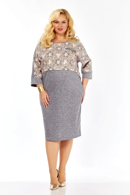 Силуэт полуприлегающий. Рукав цельнокроеный, «летучая мышь». Низ рукава на манжетах. Длина рукава от горловины 52см. Горловина платья закруглённой формы, оформлена отрезной бейкой. Перед состоит из двух частей, изготовленных их разного материала. Верхняя деталь переда выполнена из трикотажного полотна, стилизованного под гипюр. Соединение верхней и нижней частей переда имеет отлетной край. В верхней части переда, слева, расположен клапан, украшенный пришивными элементами. Спинка со средним швом. В боковых швах платья на уровне линии бёдер выполнены потайные карманы. Длина платья по спинке 104 см. 60 р. – ПОГ 63, ПОБ 65