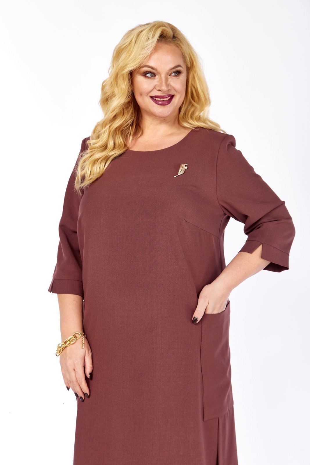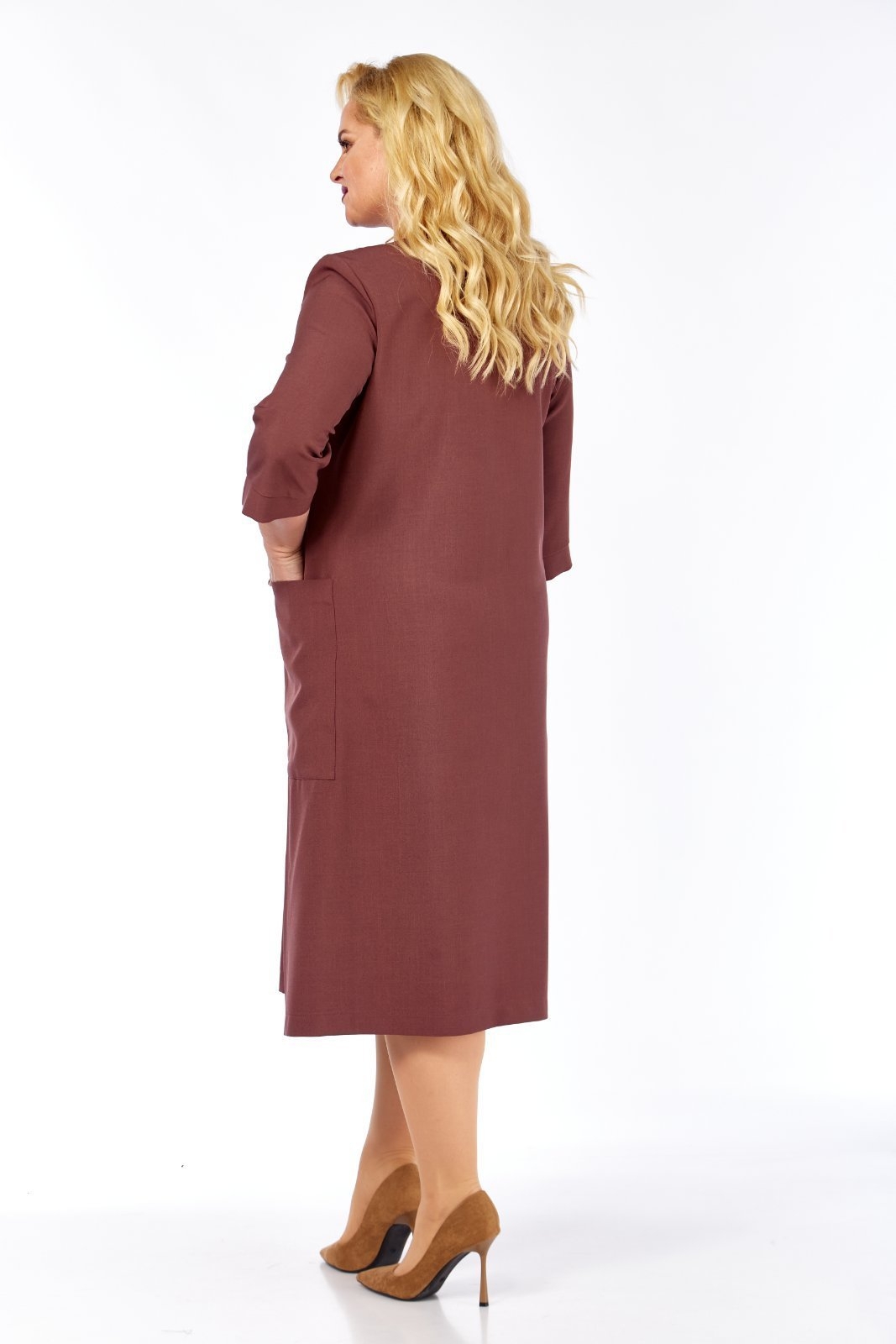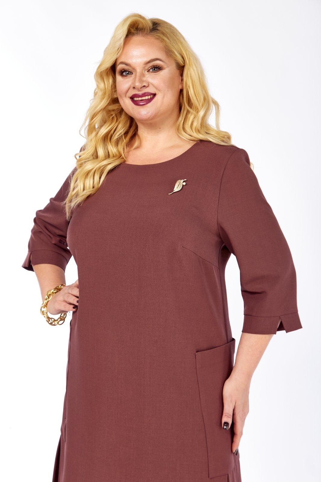 Силуэт полуприлегающий, расширенный к низу. Рукав втачной, одношовный. Внизу рукава выполнены отвороты, закреплённые патой с застёжкой на пуговицу. Длина рукава 45 см. Горловина закруглённая, на обтачке. Перед с нагрудными вытачками. На уровне бёдер по бокам расположены накладные карманы. Внизу боковых швов выполнены шлицы. Длина платья 118 см. Платье выполнено из ткани костюмно-плательной группы.