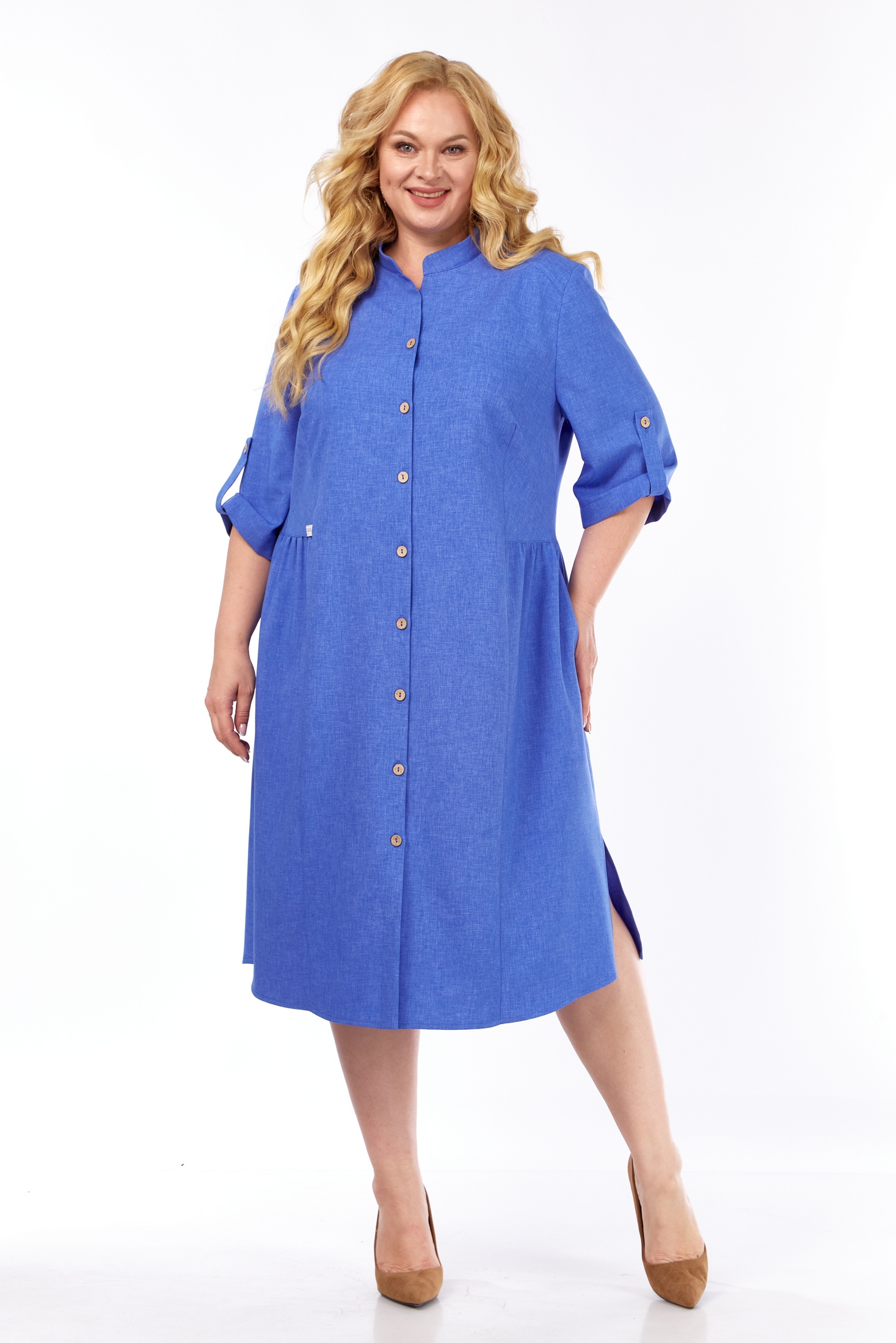 Силуэт полуприлегающий. Рукав втачной, одношовный. Низ рукава драпируется патой с застёжкой на пуговицу. Длина рукава без паты - 40 см. Воротник - стойка. Перед с вытачками, уходящими в рельеф. По переду выполнена застёжка на петли и пуговицы. Верх переда с кокетками. Спинка с вытачками, уходящими в рельеф. Между рельефами переда и спинки на уровне линии талии выполнены боковые подрезы со сборкой. На уровне бёдер в боковых швах выполнены потайные карманы. Внизу платье с разрезами. Длина платья по спинке 114 см. Платье выполнено из лёгкой ткани костюмно-плательной группы.