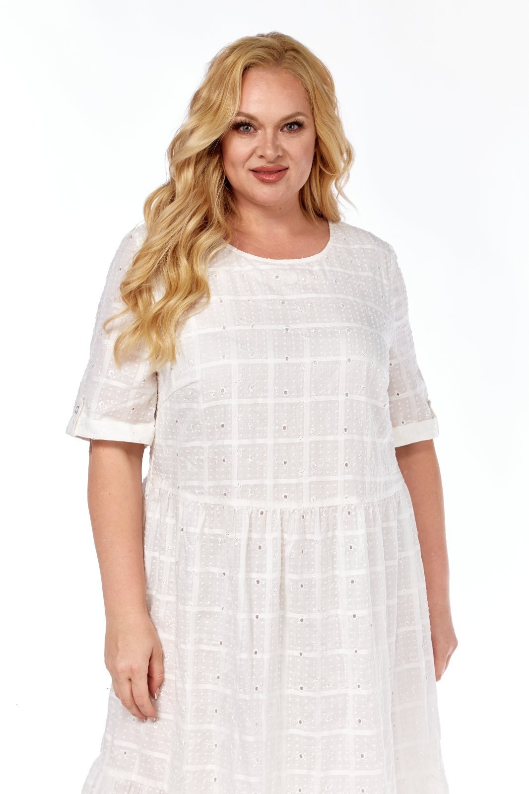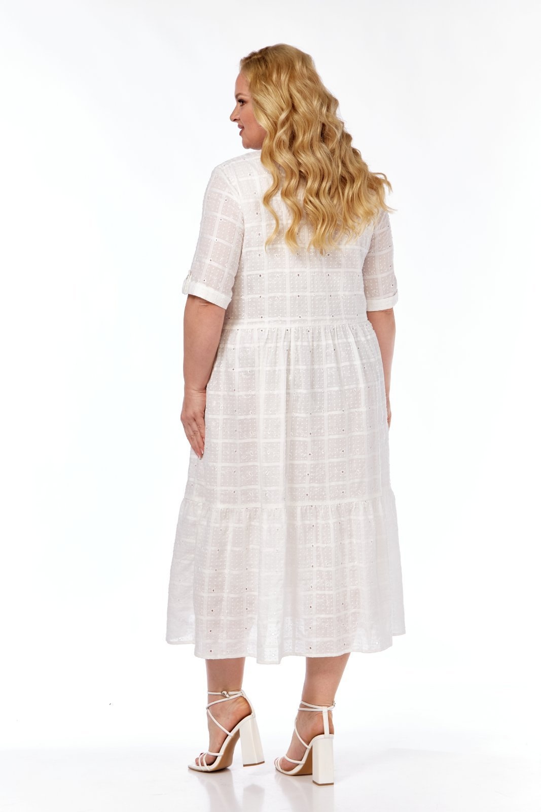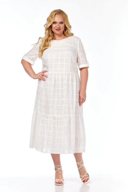 Силуэт полуприлегающий, расширенный к низу. Рукав втачной, одношовный, внизу с отворотом. Отворот фиксируется патой с застёжкой на петлю и пуговицу. Длина рукава 31 см. Горловина закруглённая. Платье на подкладке. По линии талии платье отрезное. Нижняя часть платья состоит из двух ярусов оборок со сборкой. Платье выполнено из хлопкового шитья. Длина платья по спинке 121см.