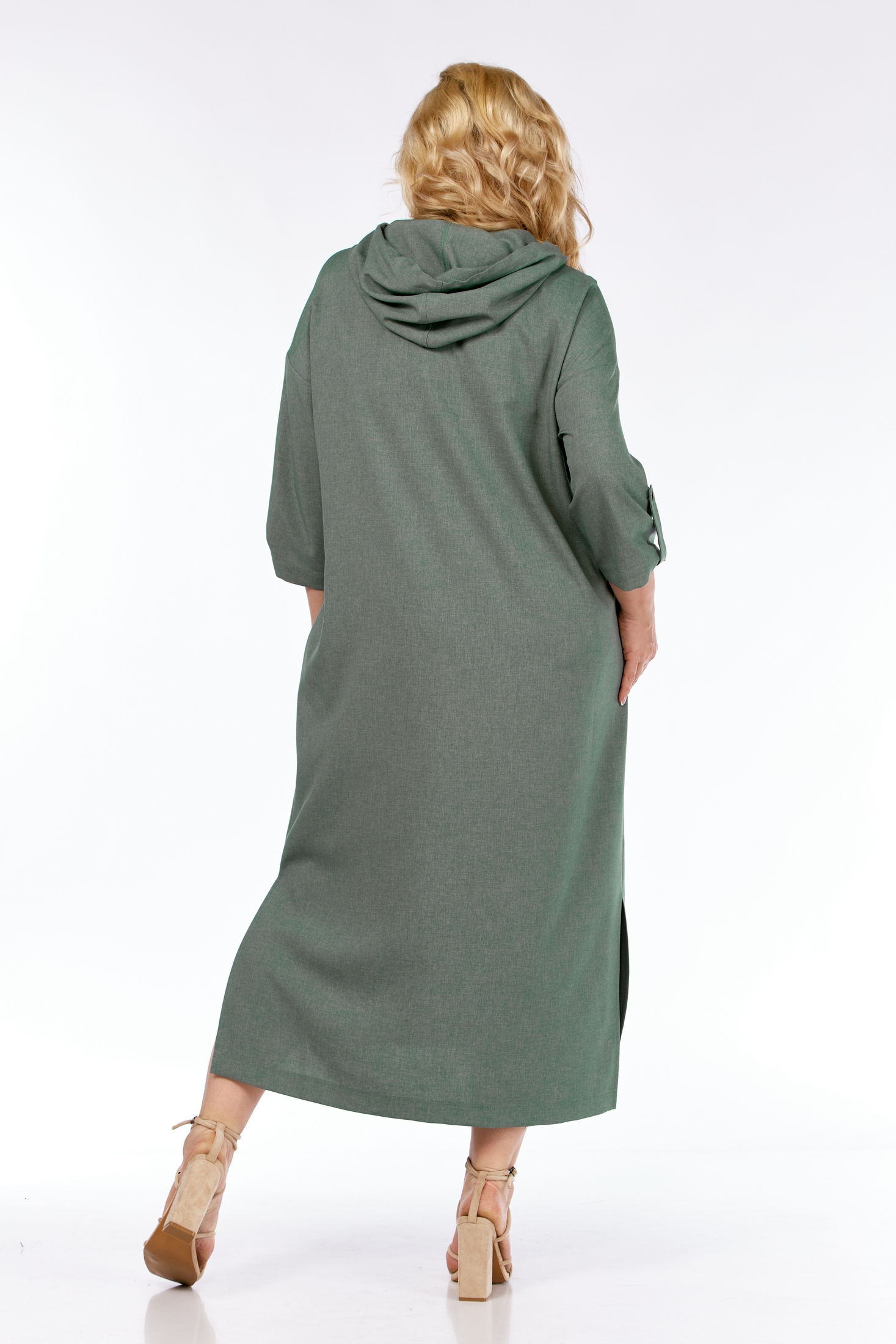 Силуэт прямой, спортивного типа. Рукав со спущенной линией плеча. Внизу рукава декорированы патой с застёжкой на пуговицу. Длина рукава от горловины 48 см. Платье с капюшоном, по краю которого заправлен шнур яркого контрастного цвета. В верхней части переда, слева, расположен накладной карман с отворотом, дополнительно украшенный пришивным элементом. В боковых швах платья на уровне бёдер выполнены потайные карманы. Внизу по боковым швам платья выполнены разрезы. Длина платья по переду 124 см. Спинка длиннее переда на 6 см. Платье выполнено из лёгкой ткани костюмно-плательной группы.