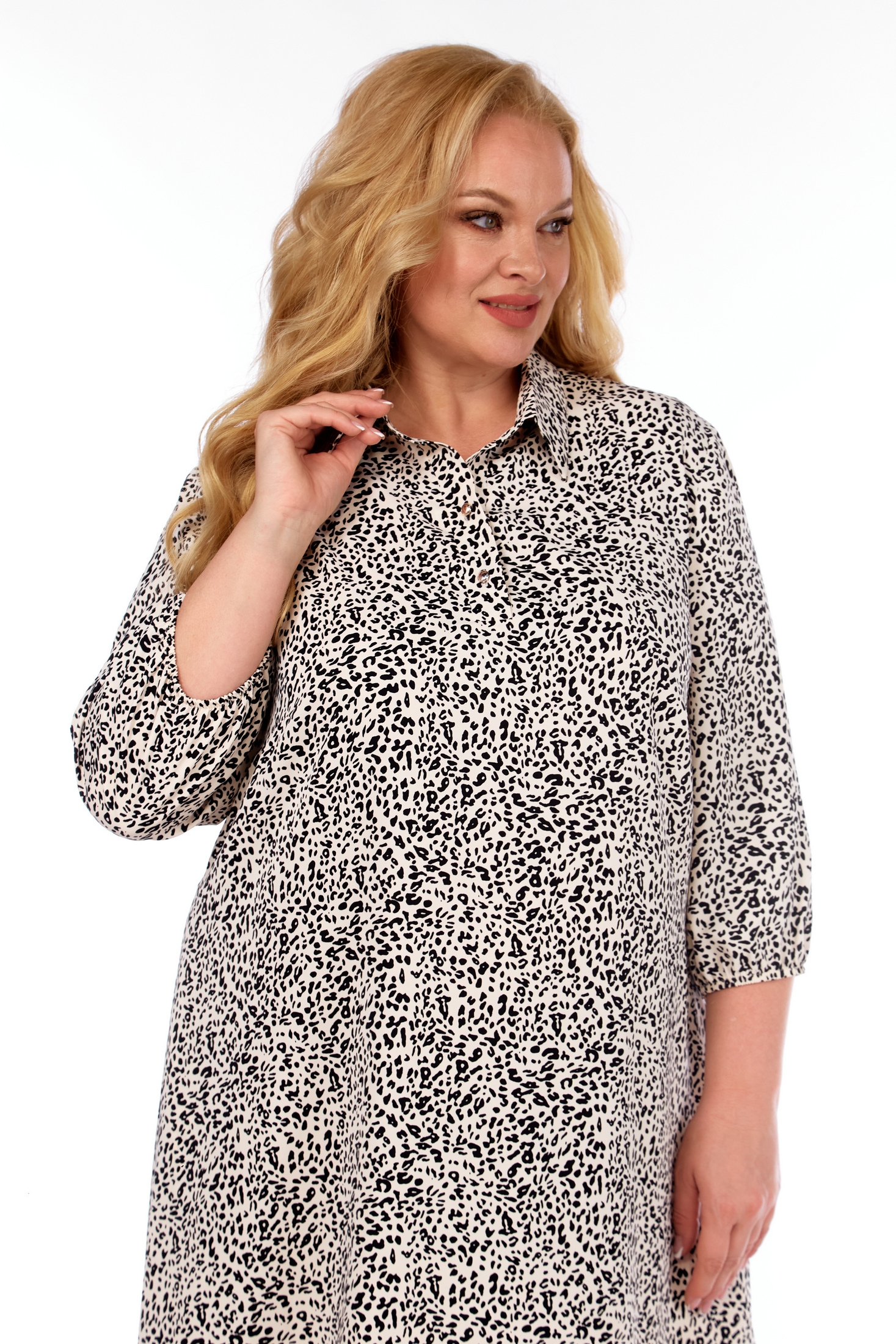 Силуэт полуприлегающий, расширенный к низу. Рукав втачной, одношовный, внизу выполнена сборка на тонкую резинку. Длина рукава 46 см. Горловина с отложным воротником на стойке, рубашечного типа. Перед с нагрудными вытачками. По центру горловины переда выполнена отрезная планка с застёжкой на две пуговицы. Спинка со средним швом. Низ платья декорирован отрезной оборкой, по которой выполнена сборка. Длина платья по спинке 135см. Платье выполнено из лёгкой плательной ткани.