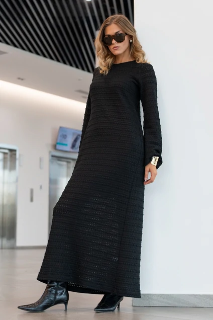 Платье макси из трикотажа, полуприлегающего А-образного силуэта. Рукав втачной прямой. Горловина округлой формы, обработана бейкой. Полупрозрачная "вязаная" текстура трикотажа делает платье стильным и романтичным. Подкладкой служит отдельное нижнее платье-комбинация на брителях из трикотажного полотна. Длина платья по центру спинки 139 см. Длина рукава 62 см.