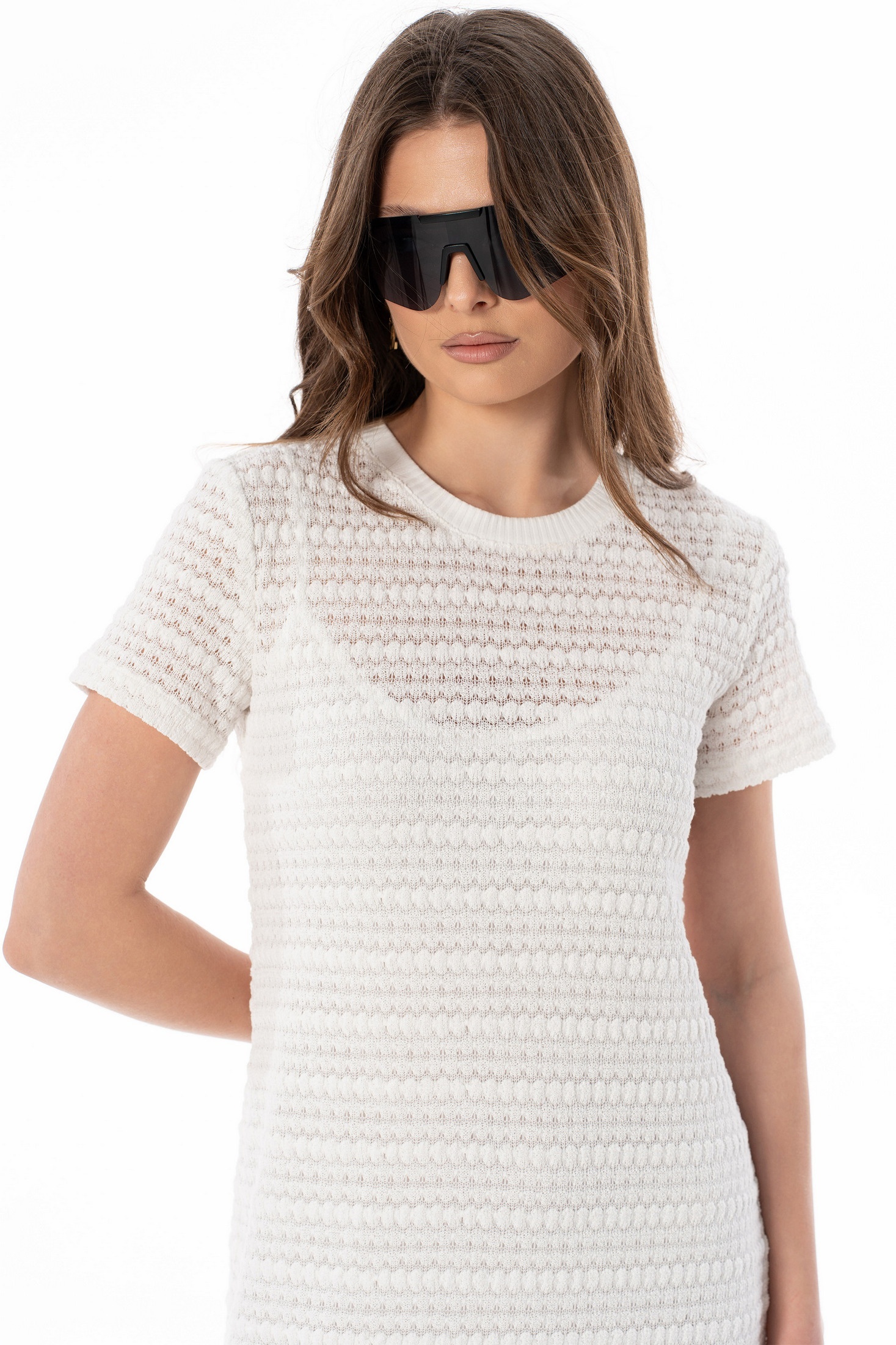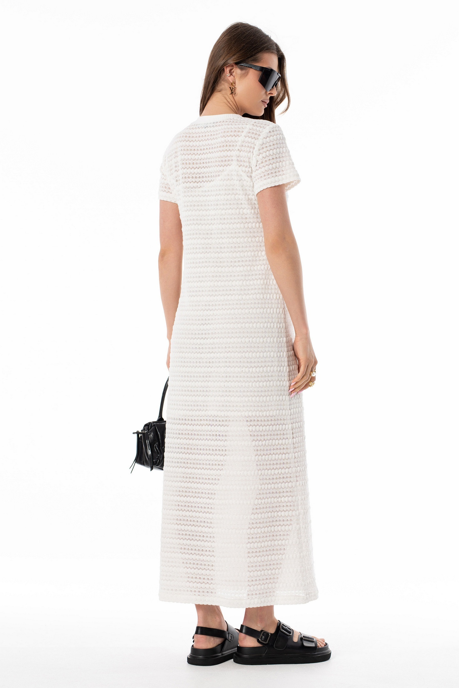 Платье 5646 SILVERSPICE от коллекции бренда SILVERSPICE — это стильное макси платье из трикотажа, полуприлегающего А-образного силуэта. Изготовлено из комбинации полиэстера и хлопка, что обеспечивает комфорт и легкость текстуры. Оригинальная полупрозрачная "вязаная" текстура дополняется подкладкой-комбинацией на бретелях. Платье оснащено прямыми втачными рукавами длиной 17 см и округлой горловиной, обработанной бейкой. Белый цвет изделия делает его идеальным для летнего сезона и различных мероприятий. Длина платья по центру спинки составляет 139 см, что подчеркивает женственность и утонченность силуэта.
