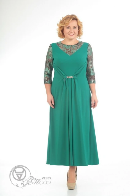 Платье женское с вставками гипюра, Х -образного силуэта с расширенной линией низа,отлётными боковыми деталями и драпировкой с пряжкой в центре. Состав ткани: вискоза 65%, п/э 30%,эластан 5% Длина по центру спинки р.50,52,54,56 - 130 см Длина рукава р.50,52,54,56 - 45 см Ширина рукава 1/2 р.50 - 16,5 см, р.52 - 17,5 см, р.54 - 18,5 см, р. 56 - 19,5 см