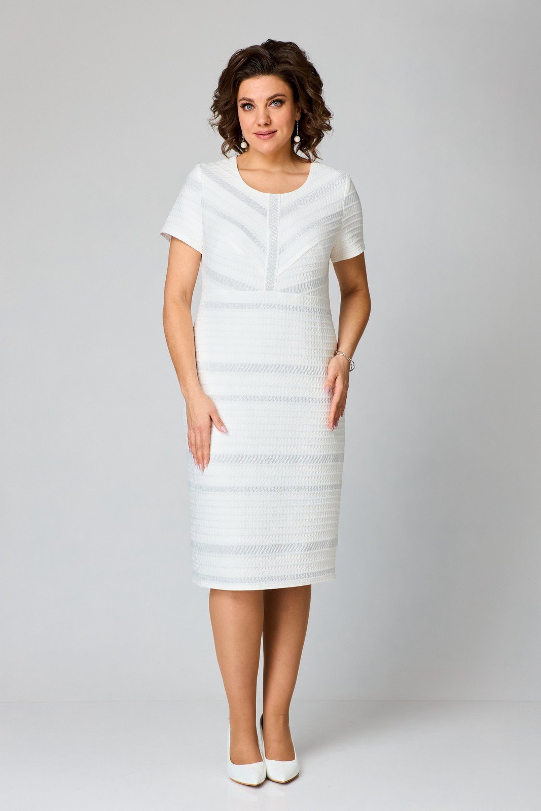 Элегантное женское платье из эластичного трикотажного жаккарда идеально подойдет для любого торжественного или делового мероприятия. Изысканный белый цвет платья дополнен уникальным жаккардовым узором, придающим изделию особый шарм. Модель с круглым вырезом горловины и короткими втачными рукавами обеспечивает удобство и комфорт. Платье полуприлегающего силуэта длиной ниже колен подчеркивает фигуру, а подрез под грудью в сочетании с центральной планкой и лифом, покроенным по косой, эффектно акцентирует талию. Создайте свой неповторимый образ с этим превосходным платьем.