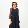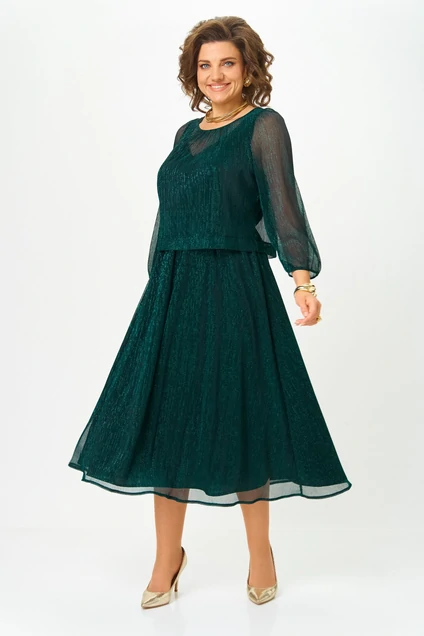 Платье Х-образного силуэта, отрезное по линии талии с расширенной линией низа и 2-ух слойным лифом-имитация костюма. Лиф на подкладке, верхняя часть отлетная по низу, перед и спинка цельнокроеные. Вырез горловины верхнего переда - круглый со сборкой по центру. Вырез горловины подкладки переда V- образный фигурной формы. Линия плеча укорочена на 3см от естественной. Рукав полуреглан, одношовный со сборкой по окату, низ на резинке. Юбка колокол на подкладке, с боковыми швами. Шов талии на резинке.