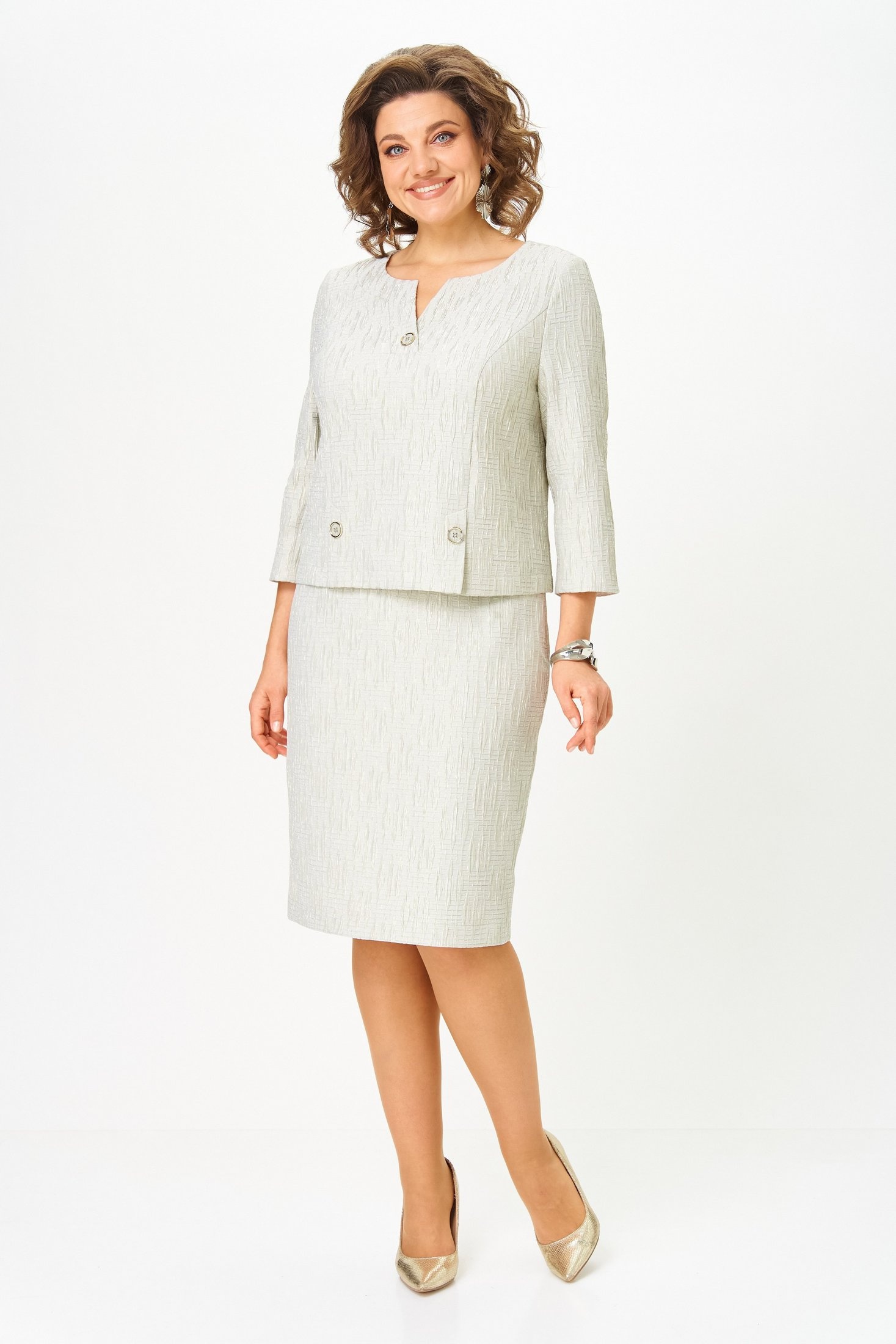Платье 564 Slavia-elit из коллекции бренда Slavia-elit представляет собой классическое решение, выполненное из комбинации вискозы и полиамида, что обеспечивает комфорт и эластичность. Фасон приталенного платья с прямой юбкой и длиной миди идеально подходит для деловых встреч и офисной работы. Особенности дизайна включают фигурный вырез горловины, шлицу сзади длиной 20 см и жакетную имитацию, создающую элегантный образ. Платье выполнено в светло-сером оттенке, который легко сочетается с различными аксессуарами. Длина по центру спинки составляет от 101 до 104 см в зависимости от размера, что позволяет выбрать идеальную посадку.