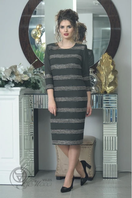 Платье полу-приталенного силуэта из мягкой и тёплой ткани , в которой рисунок полоски выполнен из фасонной нити и люрекса, что придаёт платью нарядный вид. По переду нагрудные выточки , спинка со средним швом, переходящим в шлицу. Застёжка - скрытая молния по центру спинки . Горловина округлая, рукав втачной , длина 46 см, длина платья - 99 см .