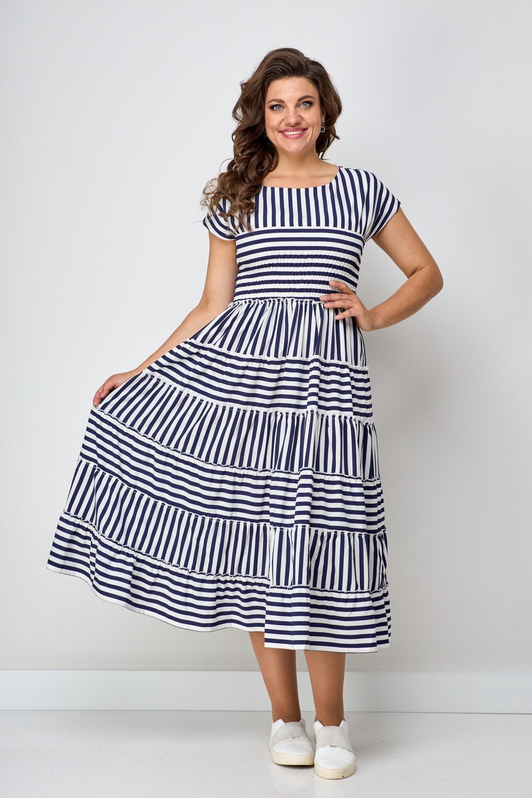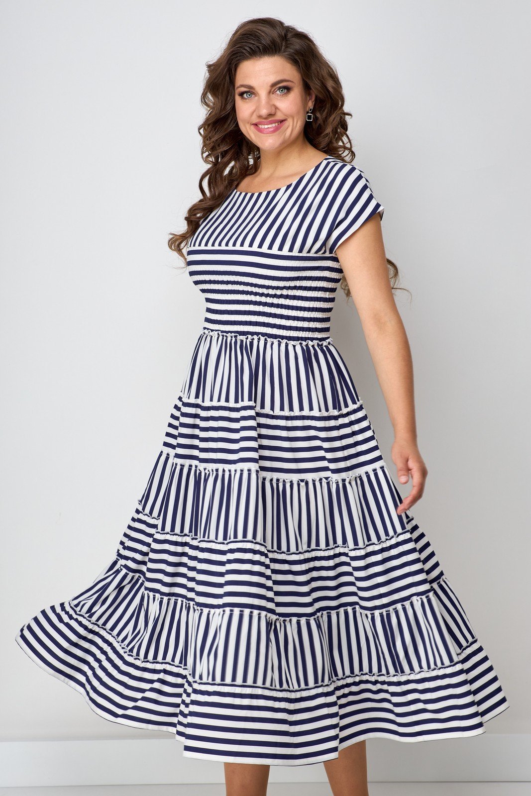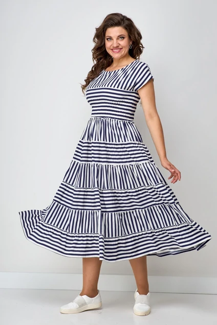 Платье женское для стильной молодой женщины. По линии талии вставлена резинка- венгерка, которая подойдет на любую фигуру. Низ изделия состоит из 5 воланов и кокетки, лиф изделия– полочка состоит из двух деталей. Верх прямой с резинкой. Рукав кимано. Верхняя часть полочки на хлопковой подкладке. Низ платья без подкладки. Изделие смотрится хорошо, за счет разного положения полоски. Платье отлично подходит для повседневной носки.