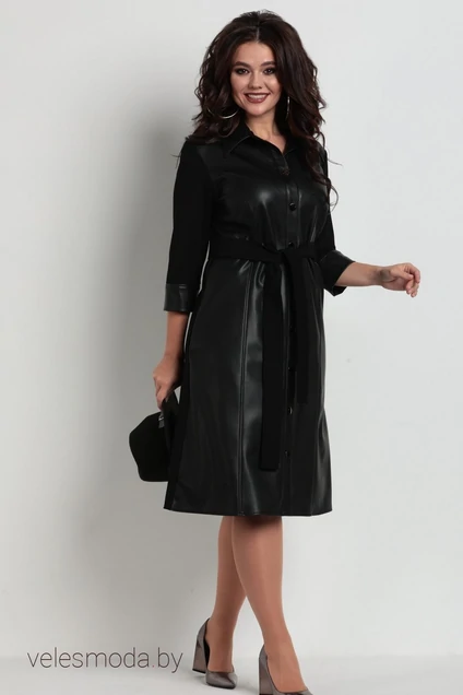 Платье женское А- образного силуэта. Выполнено из двух видов ткани, по переду из эко-кожи, а спинка из трикотажа. Воротник классический. По переду накладной карман. Застежка-планка с пуговицами. Рукав втачной,3/4 из трикотажа, а манжет из эко-кожи. Для удобства в боковых швах прорезные карманы. В комплекте идет пояс их трикотажной ткани.Длина рукава в 48р-36см, длина изделия в 48р-108см