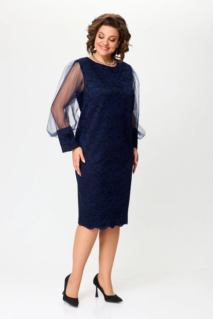 Платье женское из трёх видов ткани. Основная ткань - трикотаж с люрексом. По передней полочке по верху этой ткани идет кружевная ткань. Спереди платья нагрудные вытачки. Главным украшением платья служат рукава из двойной сетки, заканчивающиеся манжетой из основной ткани с кружевом. Горловина округлая. Деликатная стирка при 30 градусах!
