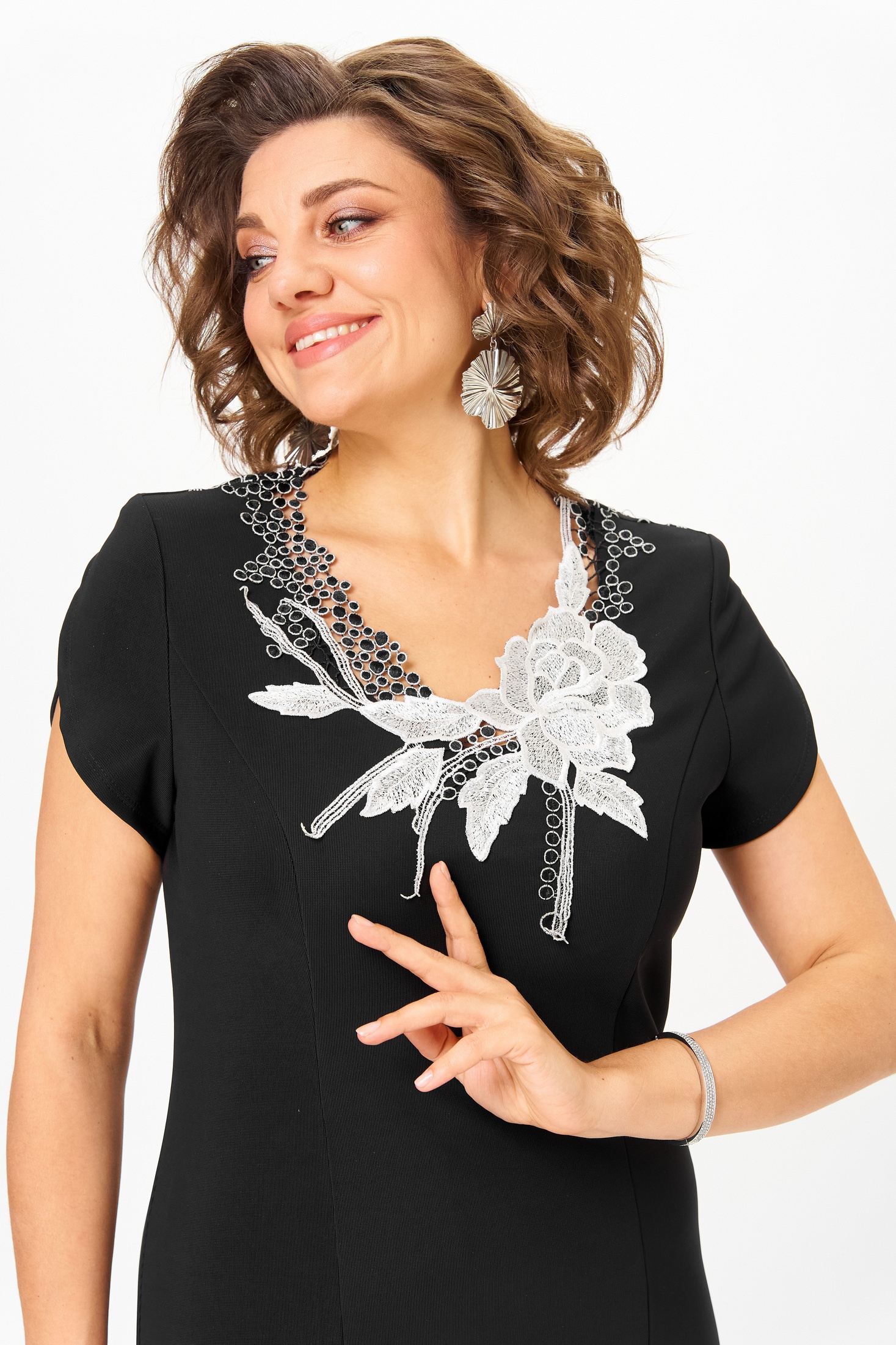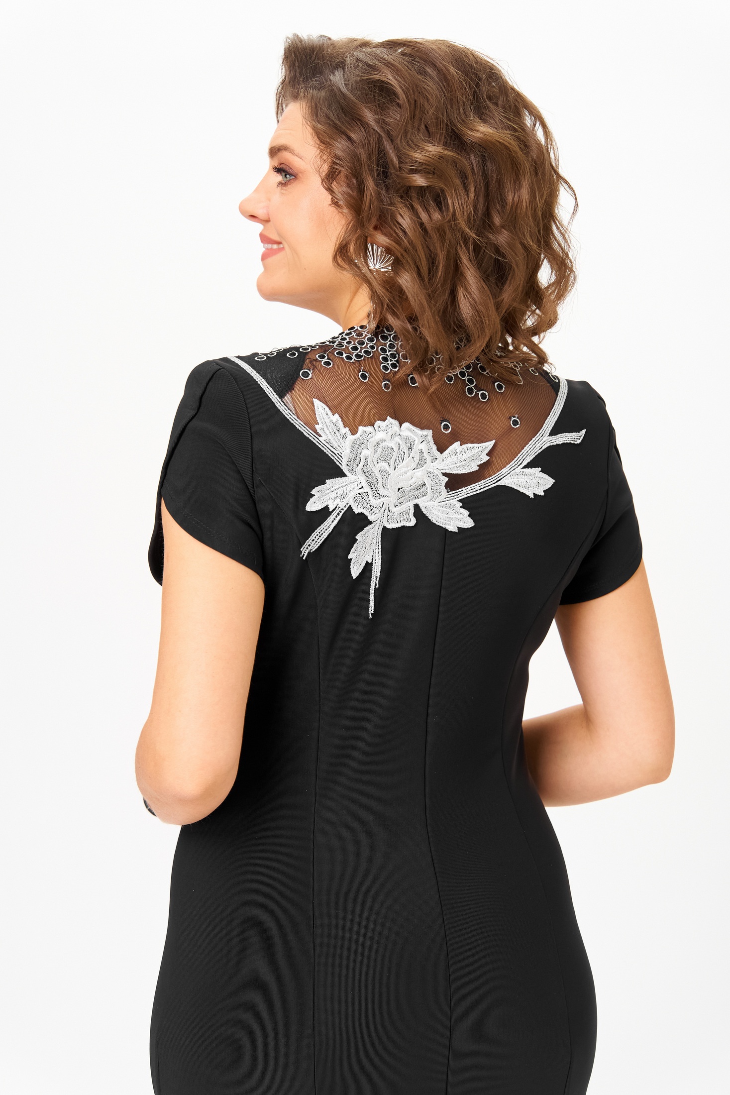 Платье облегающего силуэта. Украшением изделия служит вставка-аппликация, вышитая на сетке. Аппликация расположена спереди и по спинке платья. По передней части рельефы, внизу полочки слева вырез. Рукава короткие фигурные.