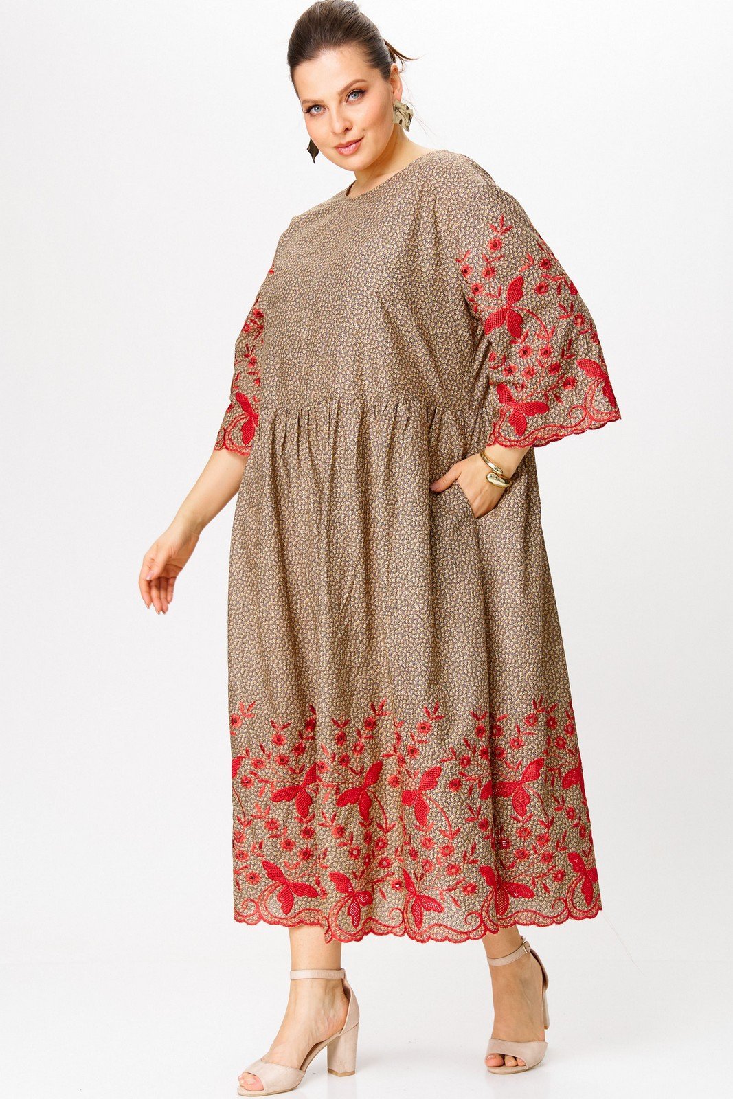 Это летнее платье в русском стиле объединяет в себе простоту и изящество. Платье выполнено из тончайшего вискозного полотна с деликатным мелким рисунком, который дополнен красивой красной вышивкой, плавно переходящей в вышитый фестон по нижнему краю и рукавам. Оно имеет углубленную горловину, а по переду отстрочены защипы для добавления объема и подчеркивания силуэта. Дизайн без подкладки и наличие функциональных карманов в боковых швах подчеркивают практичность и удобство модели. Длина платья до середины икры составляет 126 см, а длина рукава от горловины — 57 см. Это платье идеально подойдет для повседневного летнего гардероба, добавляя нотку романтичности и свободы.