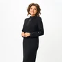 Платье женское прилегающего силуэта с втачным рукавом. По горловине воротник стойка с вырезом в форме капелька, с застежкой на воздушные петли и пуговицы. По линии груди и талии вытачки. Спинка со швом посередине с застежкой на потайную тесьму молнию, с вытачками по линии талии. Рукав длиной ¾ с фигурным разрезом и воздушными петлями и пуговицами. В левом боковом шве разрез с воздушными петлями и пуговицами. Вырез по горловине, низу рукавов и разрезу по низу платья обработан кантом.