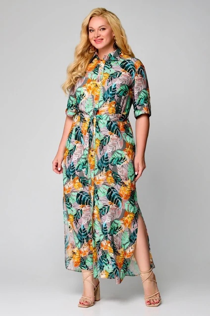 Платье рубашка прямого силуэта длиной макси. Линия плеча слегка спущена. Воротник отложной на стойке. По переду притачная планка с застежкой на 10 петель и пуговиц. По линии груди вытачки. В боковых швах карманы. По линии талии пояс в тон ткани. По верхней части спинки притачная кокетка, нижняя часть со встречной складкой. Рукав втачной, короткий понизу манжета с патой на пуговицу.