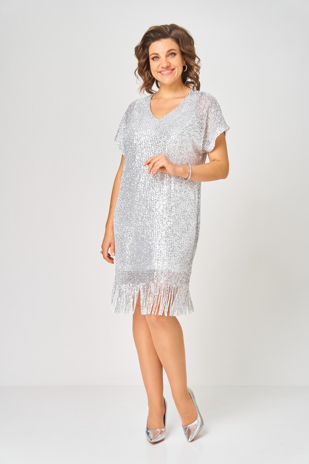 Платье нарядное с пайетками и бахромой прямого кроя, выполнено в комплектации из двух предметов. Линия плеча спущена. Вырез горловины v-образный. Нижнее платье полуприлегающего силуэта, на регулируемых бретелях. По линии груди вытачки.