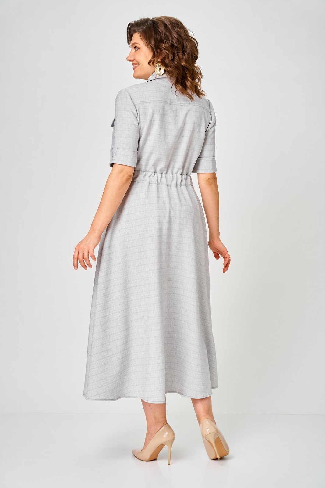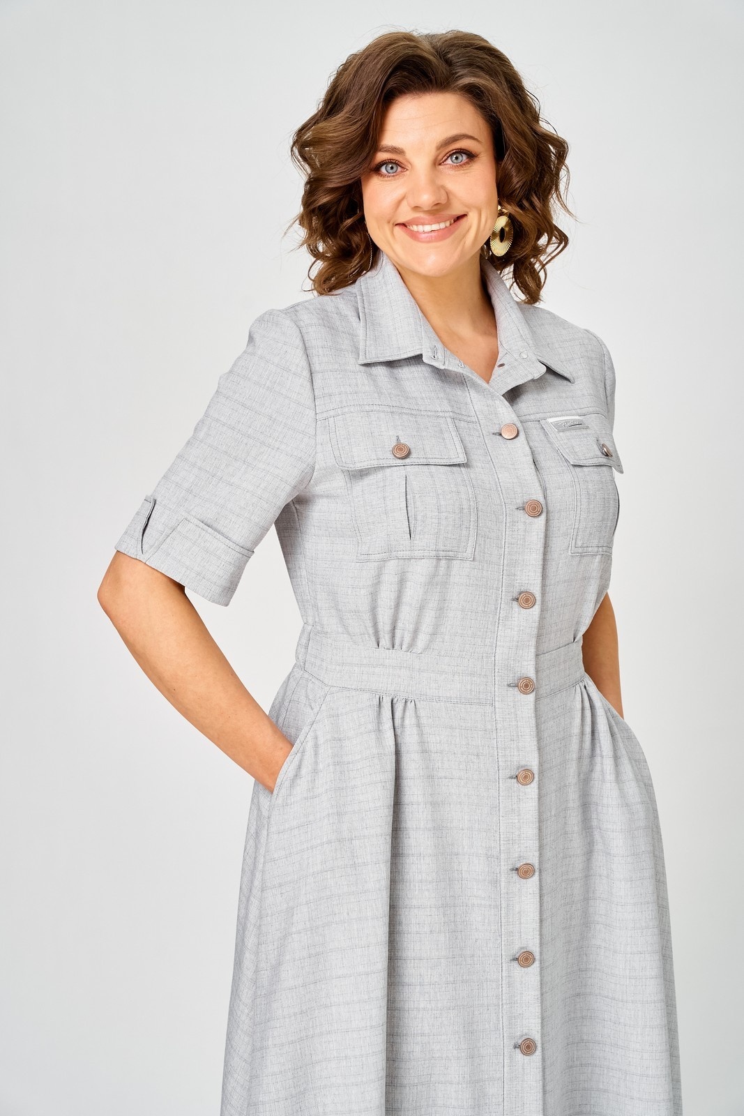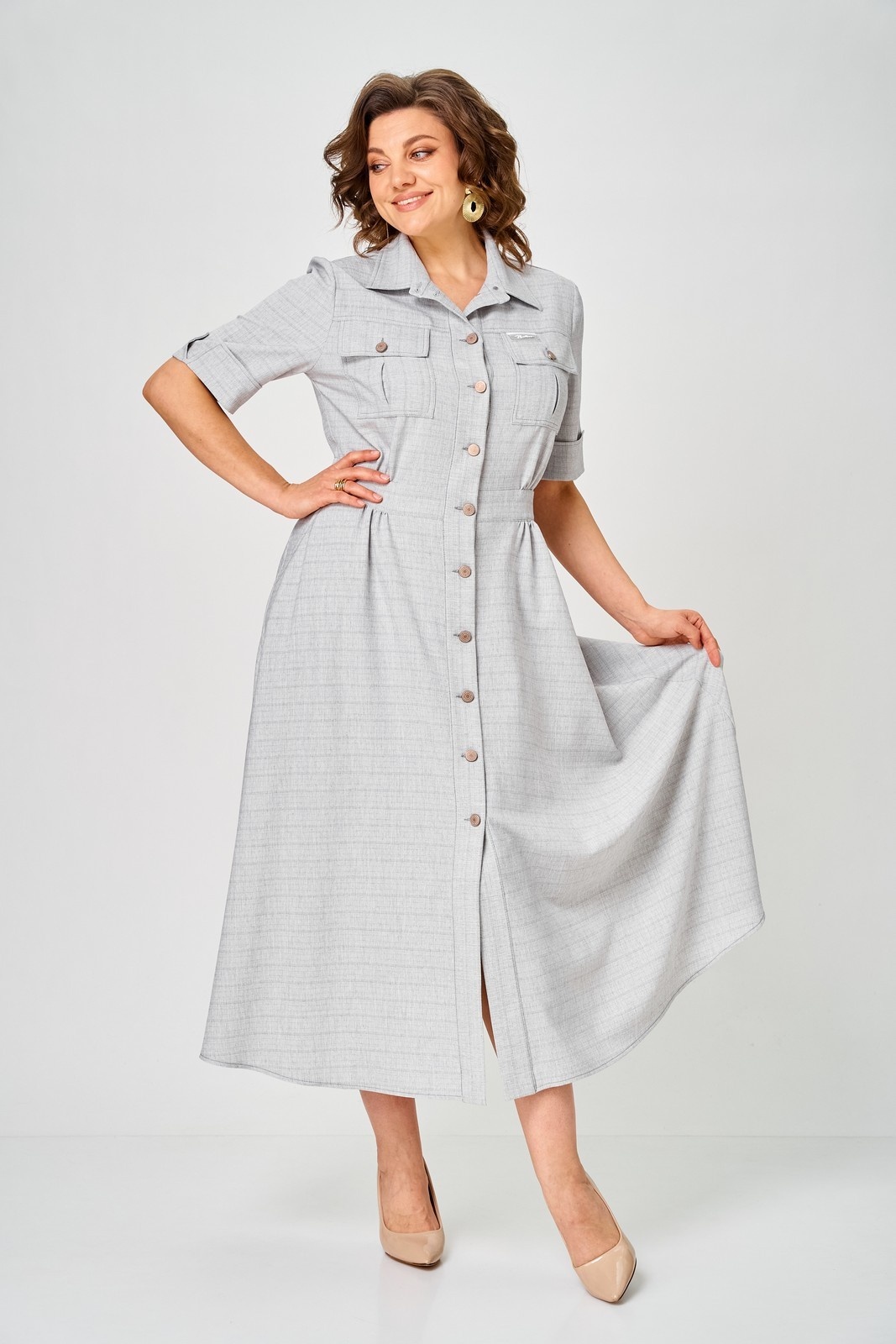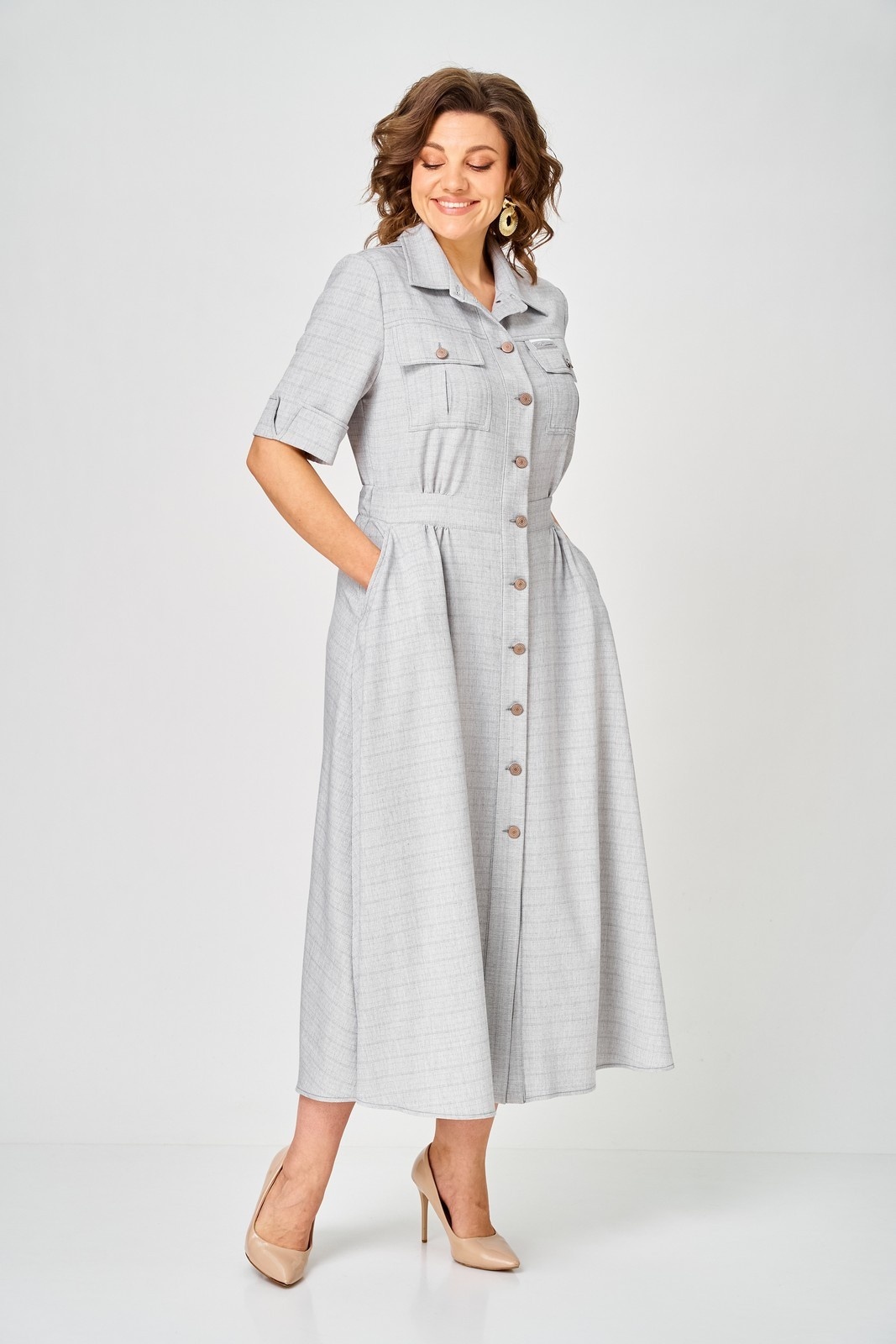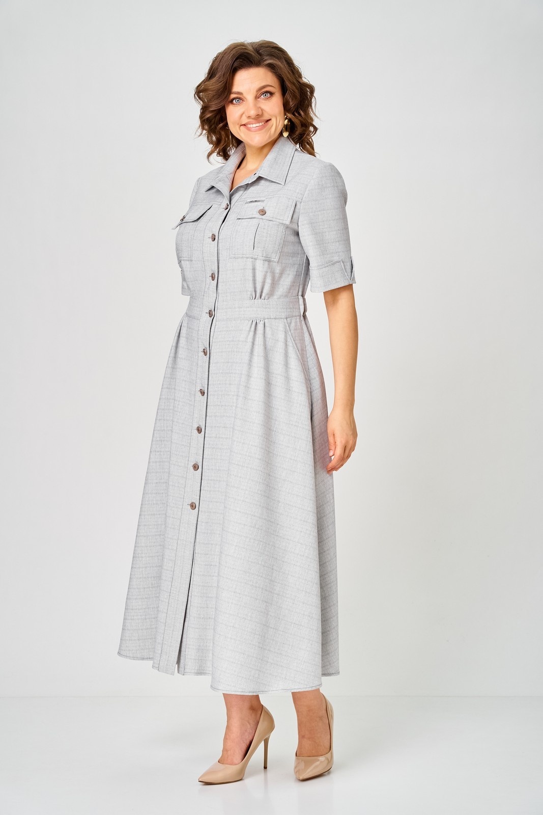 Платье 2314 серый Svetlana Style – стильное и удобное платье от коллекции бренда Svetlana Style. Изготовлено из качественной ткани, состоящей на 58% из хлопка, что обеспечивает комфорт и воздухопроницаемость. Полуприлегающий силуэт и расклешенная юбка подчёркивают женственность, а эластичная резинка на талии обеспечивает идеальную посадку. Центральная планка с пуговицами и отложной воротник на стойке добавляют классическую нотку. Практичные карманы с клапаном удобны для повседневного использования. Рукава длиной ¾ с отложной манжетой подходят для изменения стиля. Длина платья по спинке составляет 130 см, а рукав – 30 см. Серый цвет делает платье универсальным выбором для работы и повседневной носки в любое время года.
