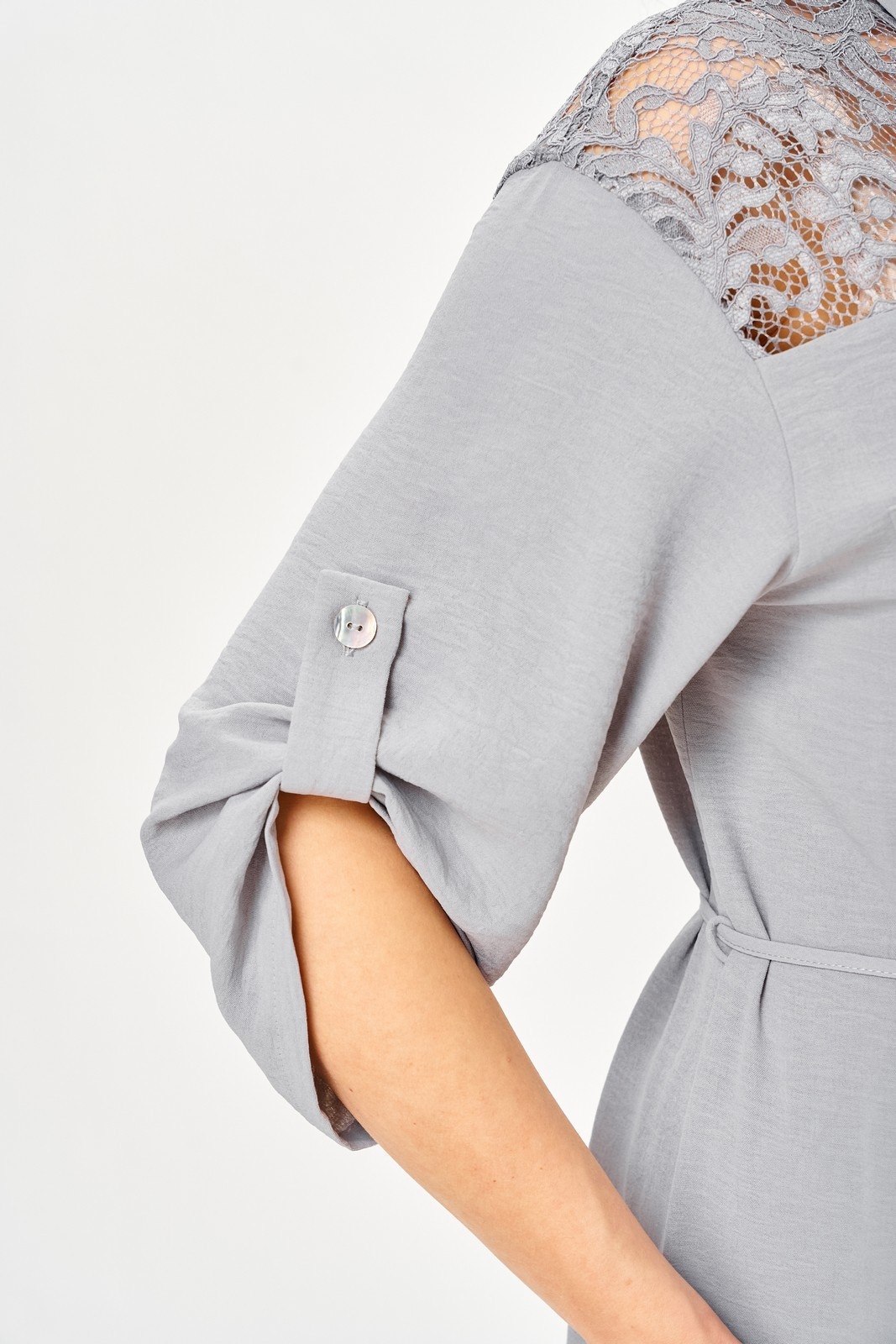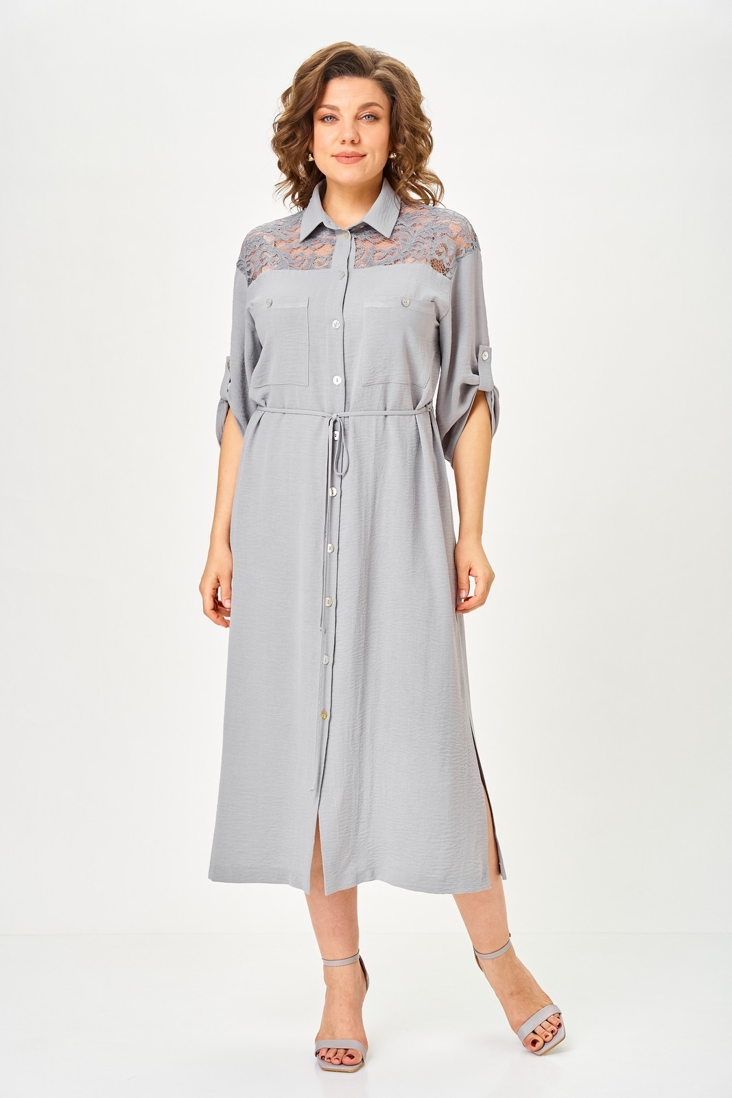Платье женское в стиле сафари прямого силуэта с декором из кружева. Втачные рукава длиной ¾, по низу регулируются патой. Линия плеча спущена. Застежка центральная на петли и пуговицы. Воротник отложной на стойке. Нижняя часть спинки со складкой из-под кокетки. Верхняя часть переда с накладными карманами. В боковых швах разрезы. По линии талии съемный пояс в тон.