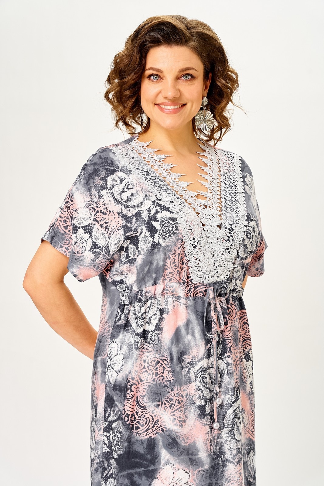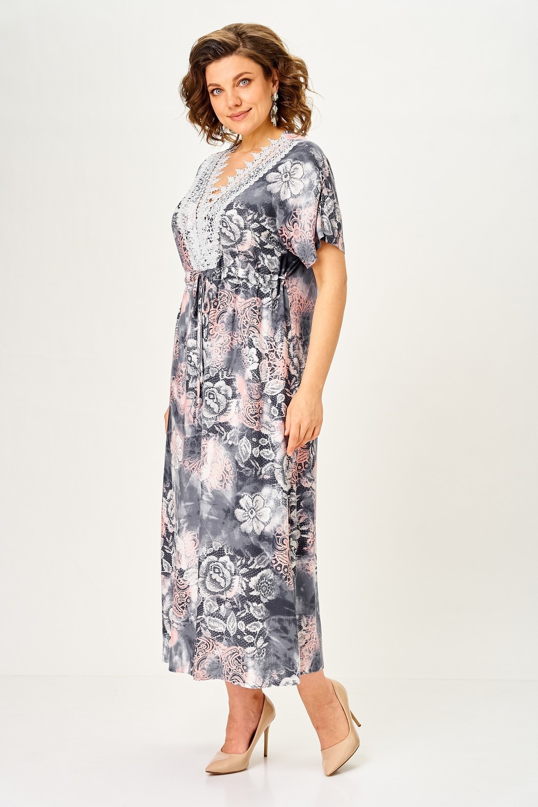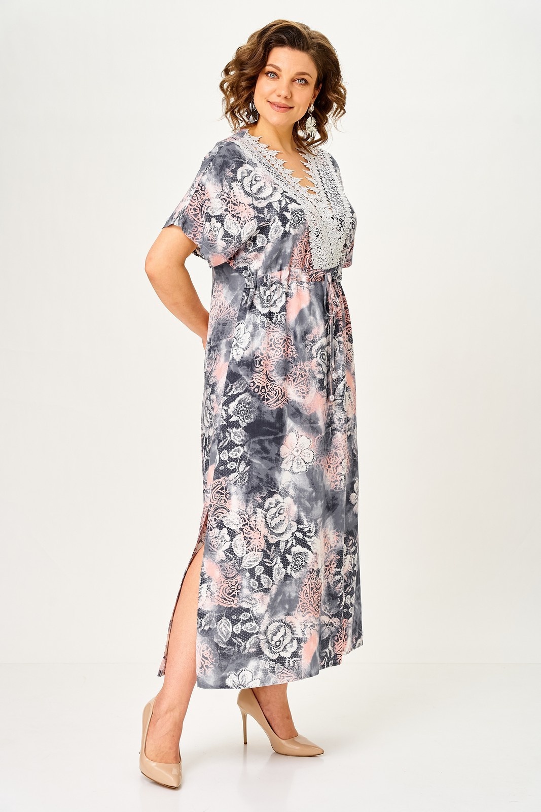Платье 2346 Svetlana Style из коллекции бренда Svetlana Style. Это платье свободного прямого силуэта с цельнокроеным рукавом обеспечивает комфорт и свободу движений. Изготовленное из 100% хлопка, оно идеально подходит для весенне-летнего сезона. V-образный вырез горловины, декорированный кружевом, добавляет элемент утонченности. Спереди, чуть выше линии талии, предусмотрена кулиса для дополнительной регулировки. Спинка оборудована средним швом, а в боковых швах находятся разрезы, придающие легкость и динамичность образу. Длина платья по спинке составляет 130 см, а длина рукава от горловины — 35 см. Цветочный узор добавляет нежности и романтичности, делая это платье идеальным выбором для повседневных прогулок или праздничных мероприятий.