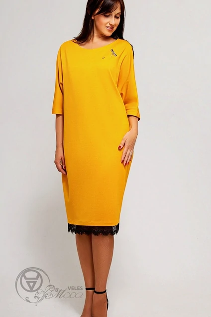 Платье женское, свободного силуэта. Потайная молния в среднем шве. Горловина круглая, обточная. Рукав «летучая мышь». В боковом шве карман. По низу платья кружево. В комплекте декоративная брошь. Длина изделия 99 см (±1-2 см) с учётом кружева.