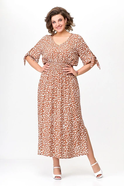 Платье женское полуприлегающего силуэта, длиной maksi. Выполнено из вискозной ткани. Перед и спинка платья цельнокроеные. По линии талии, платье собрано на 8 рядов, отстроченных эластичной тесьмой. Перед с V-образной горловиной. Рукав втачной, короткий, с притачной манжетой, переходящей в завязку. В нижней части боковых швов обработаны разрезы.
