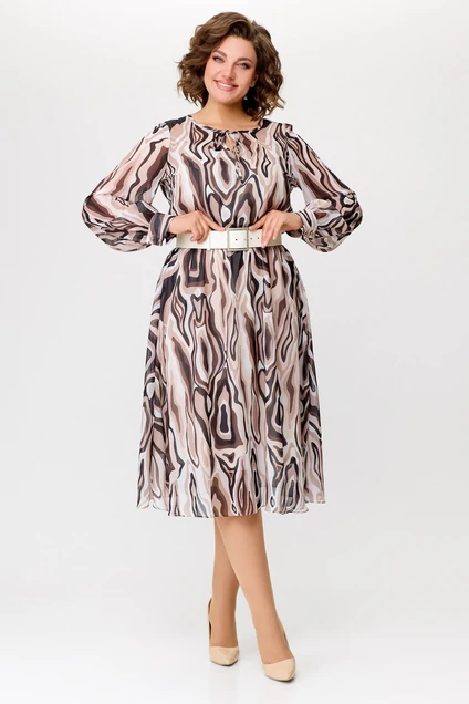 Платье Х-силуэта длиной миди, выполнено из шифона на трикотажной подкладке. Лиф отрезной по линии талии. Перед и спинка лифа цельнокроеные. Нижняя часть платья клешеная. Талия регулируется резинкой. Подкладка верхней части платья на бретелях. Рукав длинный втачной. По низу рукава сборка и притачная манжета, застёгивающаяся на 2 петли и пуговицы. Горловина округлой формы, по центру переда капелька с завязкой.