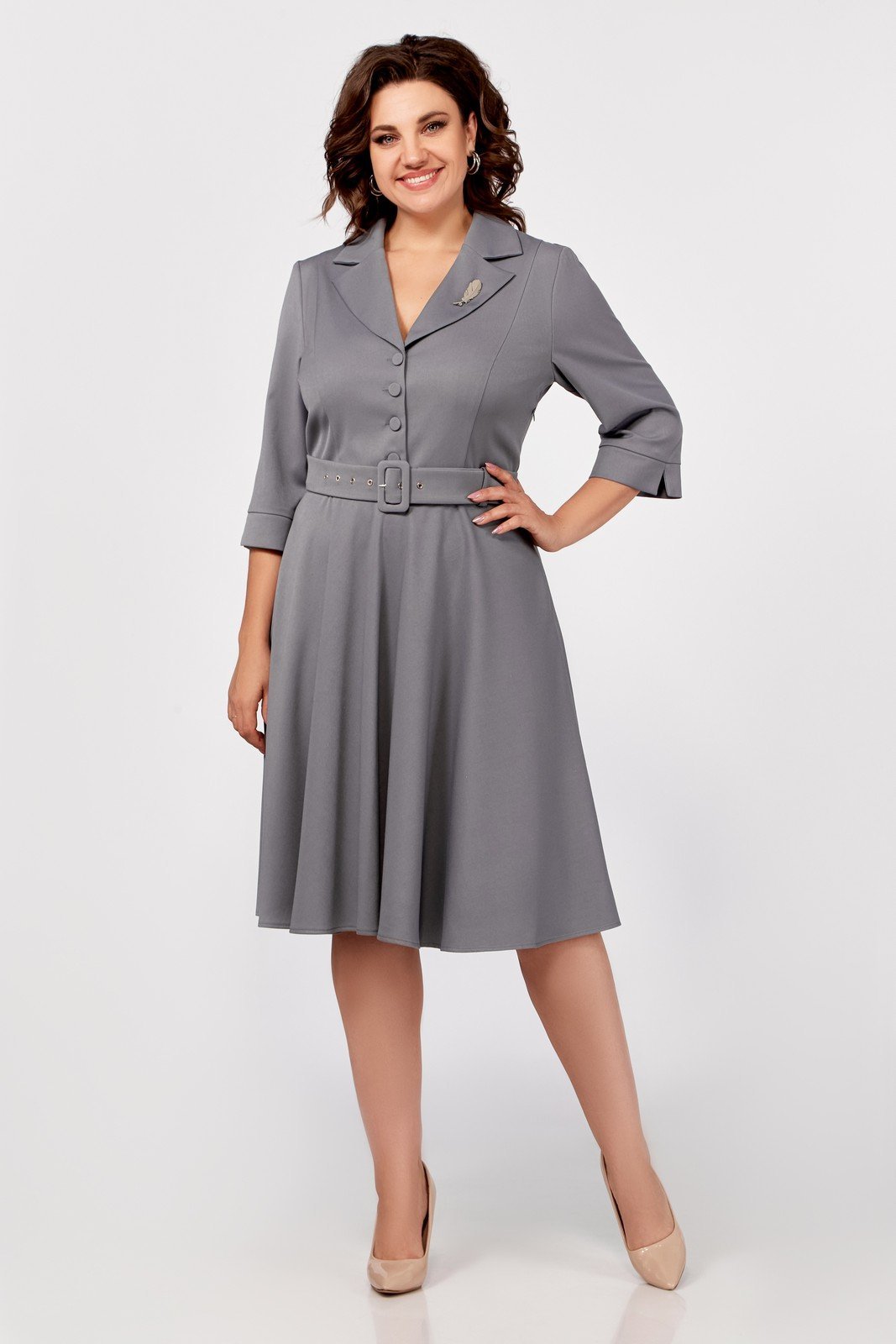 Платье из мягкой вискозной ткани, Х-образного силуэта с полуприлегающим лифом. Платье отрезное по линии талии. Перед лифа с вертикальными рельефами и застёжкой на петли и 4 декоративные пуговицы. Горловина V-образной формы, с отложными лацканами и воротником пиджачного типа. Спинка лифа с талиевыми выточками. Рукав втачной, длиной ¾, по низу манжет с разрезом. Застёжка в боковом шве на потайную тесьму молнию. В комплекте пояс из основной ткани с пряжкой, лацкан украшен отстёгивающейся брошью.