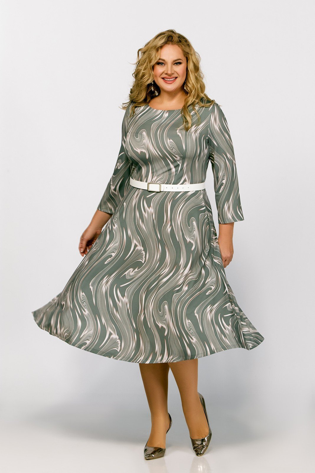 Платье из тонкого эластичного полотна, отрезное по линии талии. Лиф полуприлегающего силуэта, по полочке и спинке расположены талиевые выточки. Юбка А-силуэта, с карманами в боковых швах. В среднем шве спинки застёжка на потайную тесьму молнию. Горловина округлой формы. Рукав втачной длиной ¾. В комплекте ремень с декоративной пряжкой.