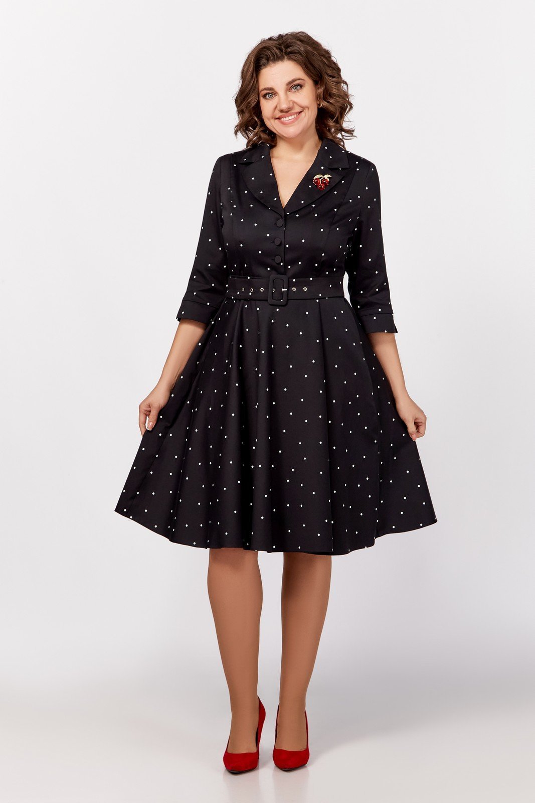 Платье из хлопковой ткани, Х-образного силуэта с полуприлегающим лифом. Платье отрезное по линии талии. Перед лифа с вертикальными рельефами и застёжкой на петли и 4 пуговицы, обтянутые основной тканью. Горловина V-образной формы, с отложными лацканами и воротником пиджачного типа. Спинка лифа с талиевыми выточками. Рукав втачной, длиной ¾, по низу манжет с разрезом. Застёжка в боковом шве на потайную тесьму молнию. В комплекте пояс из основной ткани с пряжкой, лацкан украшен отстёгивающейся брошью.