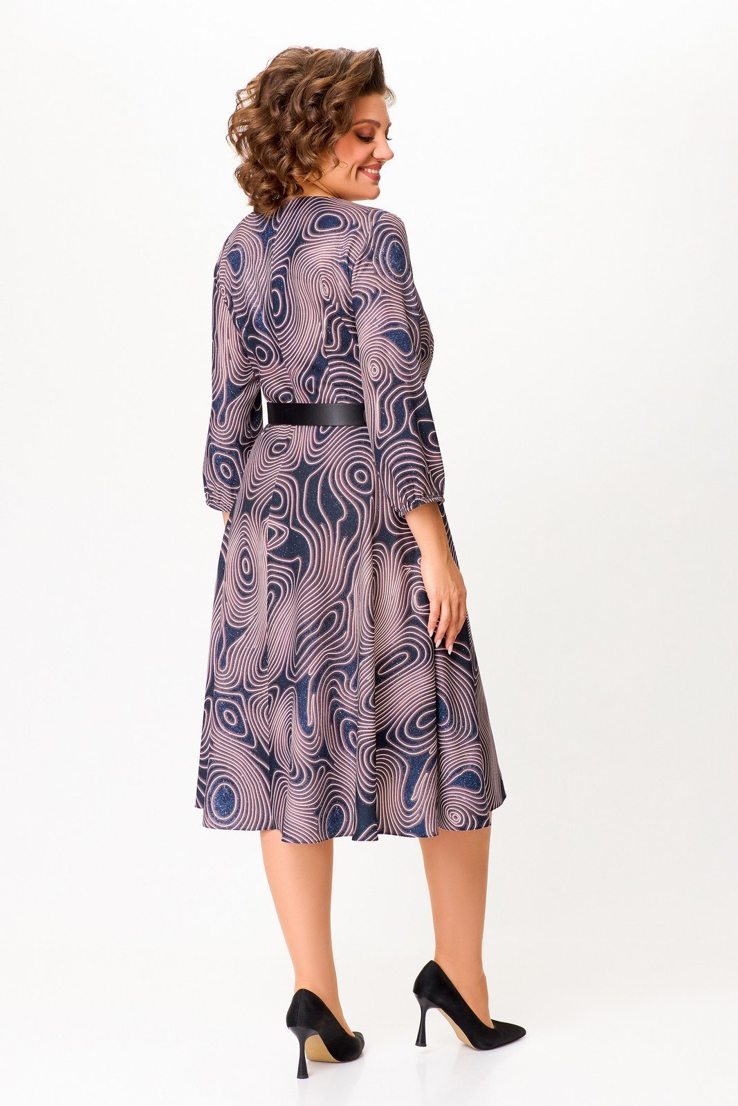 Платье из мягкой вискозной ткани, Х-образного силуэта, отрезное по линии талии. Перед и спинка лифа с талиевыми вытачками. Юбка расклешённая с карманами в боковых швах. В среднем шве спинки застёжка на потайную тесьму молнию. Горловина округлой формы, рукав втачной длиной 4/5, по низу собран на эластичную тесьму-резинку.