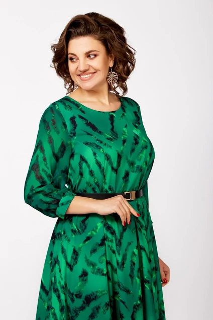 Платье из легкой плательной ткани Х-образного силуэта с полуприлегающим лифом. Платье отрезное по линии талии. По переду лифа расположены рельефы, по спинке лифа - талиевые вытачки. Юбка расклешенная из шести клиньев со встречными складками по линии талии. В среднем шве спинки предусмотрена молния. Рукав втачной. длиной ¾, выполнен из прозрачной шифоновой ткани в тон платья, по низу манжета с эластичной вставкой.В комплекте ремень с декоративной пряжкой.В размере 64 пояс из основной ткани.