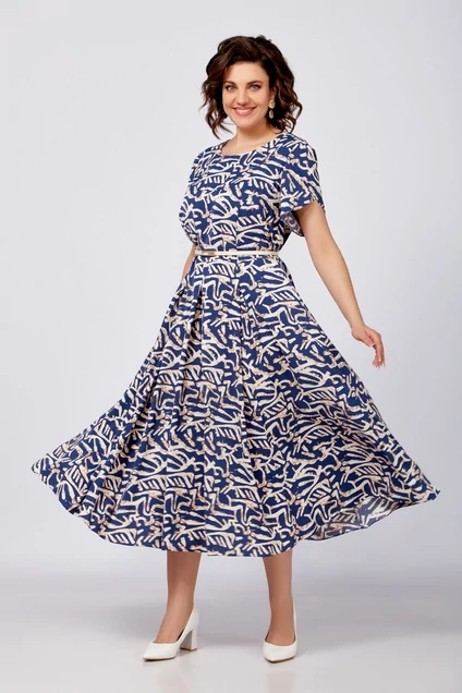 Платье из мягкой вискозной ткани Х-образного силуэта с полуприлегающим лифом. Платье отрезное по линии талии. По переду лифа расположены рельефы, по спинке лифа талиевые вытачки. Юбка расклешенная из шести клиньев со встречными складками по линии талии. В среднем шве спинки предусмотрена потайная тесьма-молния. Рукав втачной покроя тюльпан, длина рукава 15 см. В комплекте ремень с декоративной пряжкой.
