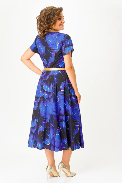 Платье женское из мягкой вискозной ткани, Х-образного силуэта с полуприлегающим лифом. Платье отрезное по линии талии. По переду лифа отрезные рельефы, по спинке талиевые вытачки. Юбка расклешённая из шести клиньев со встречными складками по линии талии. В среднем шве спинки застёжка на потайную тесьму-молнию. Рукав втачной покроя тюльпан, длина рукава 15 см.