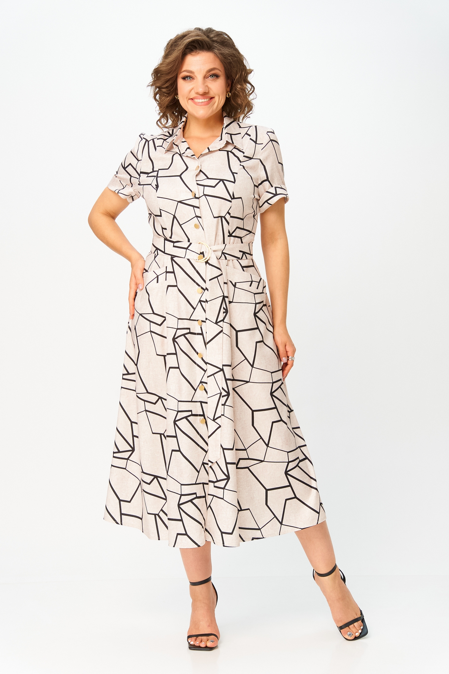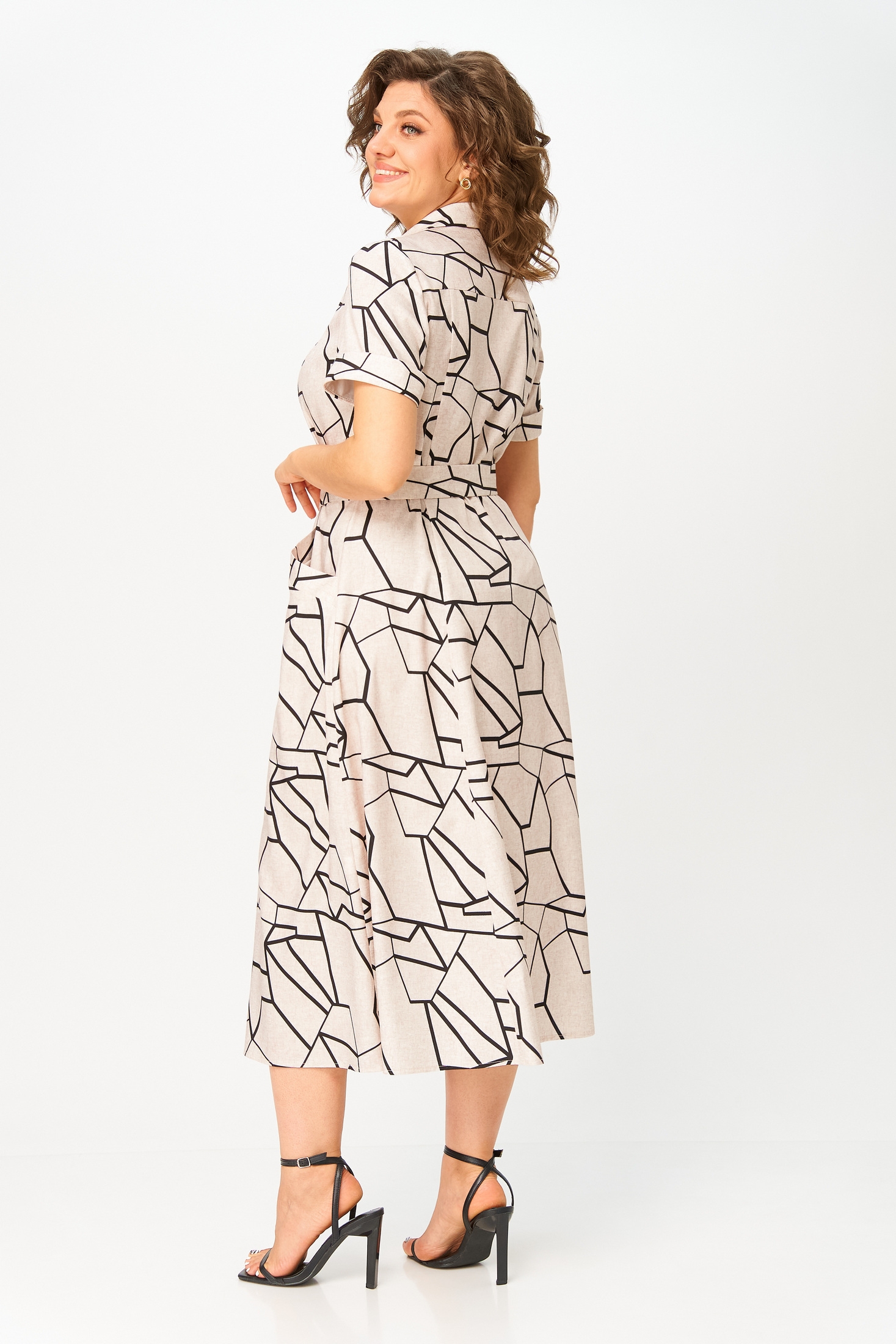 Платье из мягкой вискозной ткани, отрезное по линии талии с полуприлегающим лифом и юбкой А-силуэта, с центральной застёжкой на петли и декоративные пуговицы. Полочка с вертикальными рельефами, спинка с кокеткой и отрезными бочками. Юбка состоит из семи клиньев. По переду между швами обработан карман с планкой на косую. Воротник отложной рубашечного типа, с отрезной стойкой. Рукав втачной короткий, по низу с отложной манжетой.